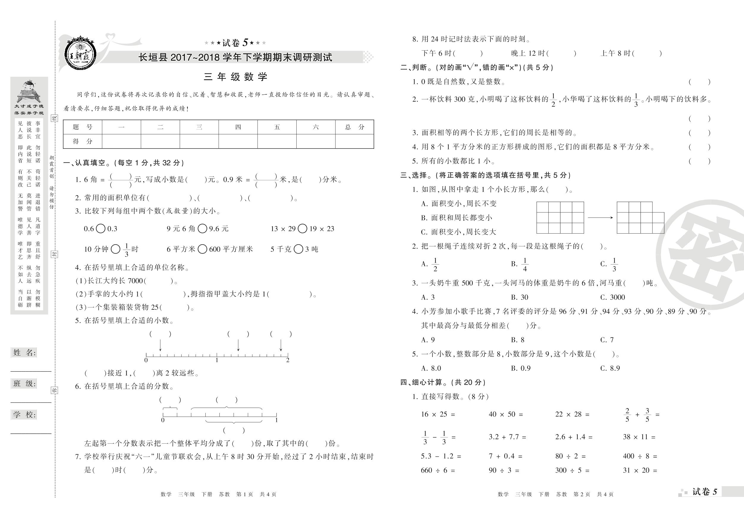 2017-2018学年第二学期长垣市三年级数学试卷(苏教版)【5】