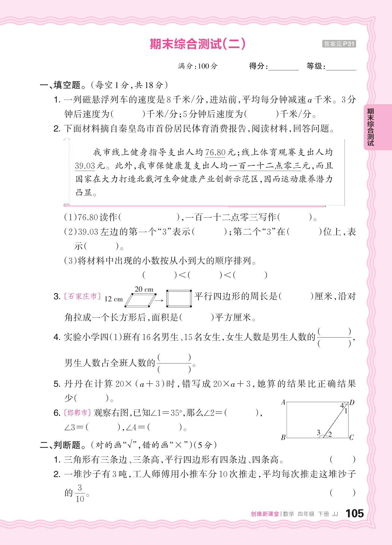 2024春下册四年级数学冀教版 期末综合测试(二)