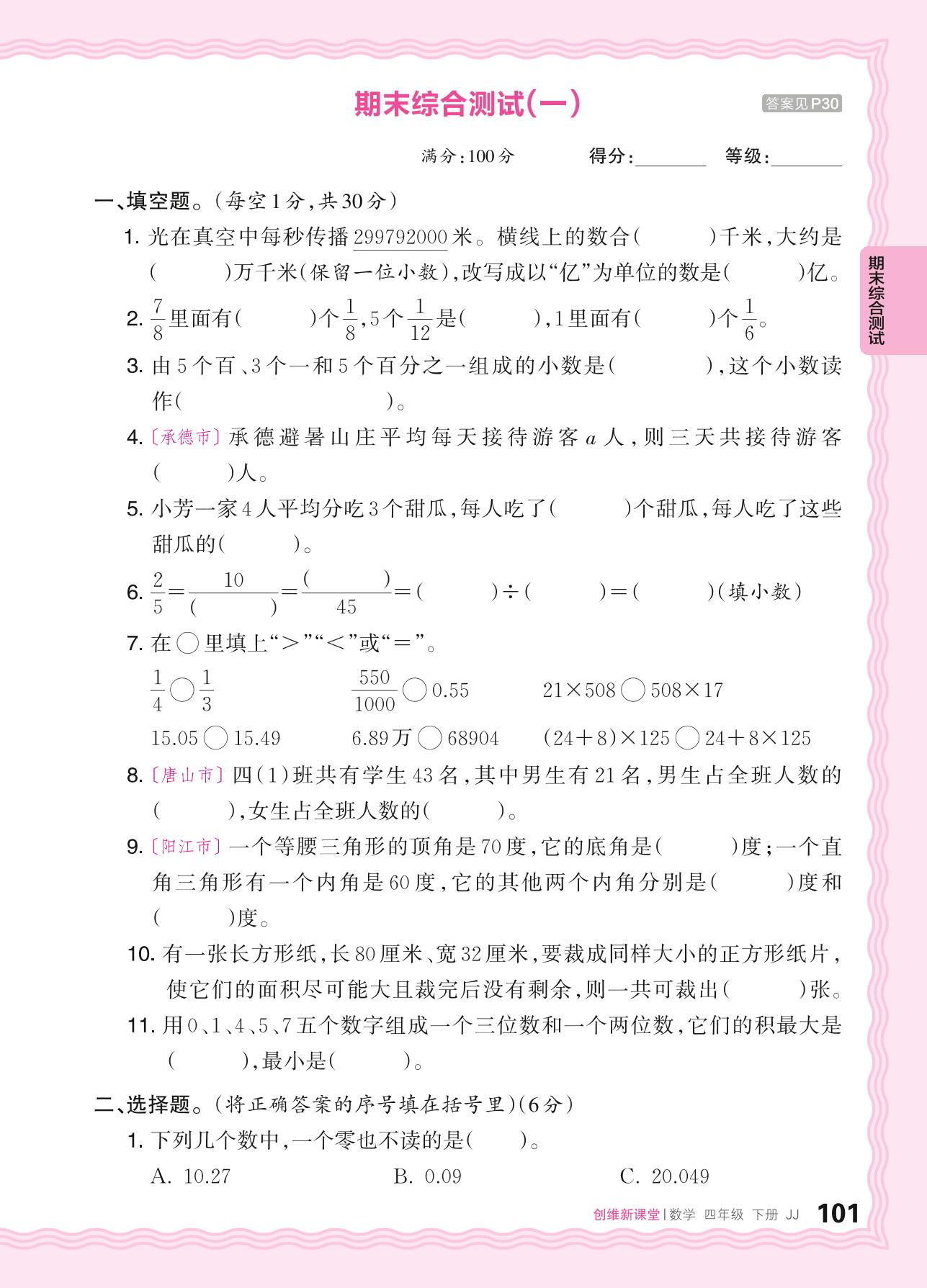 2024春下册四年级数学冀教版 期末综合测试(一)