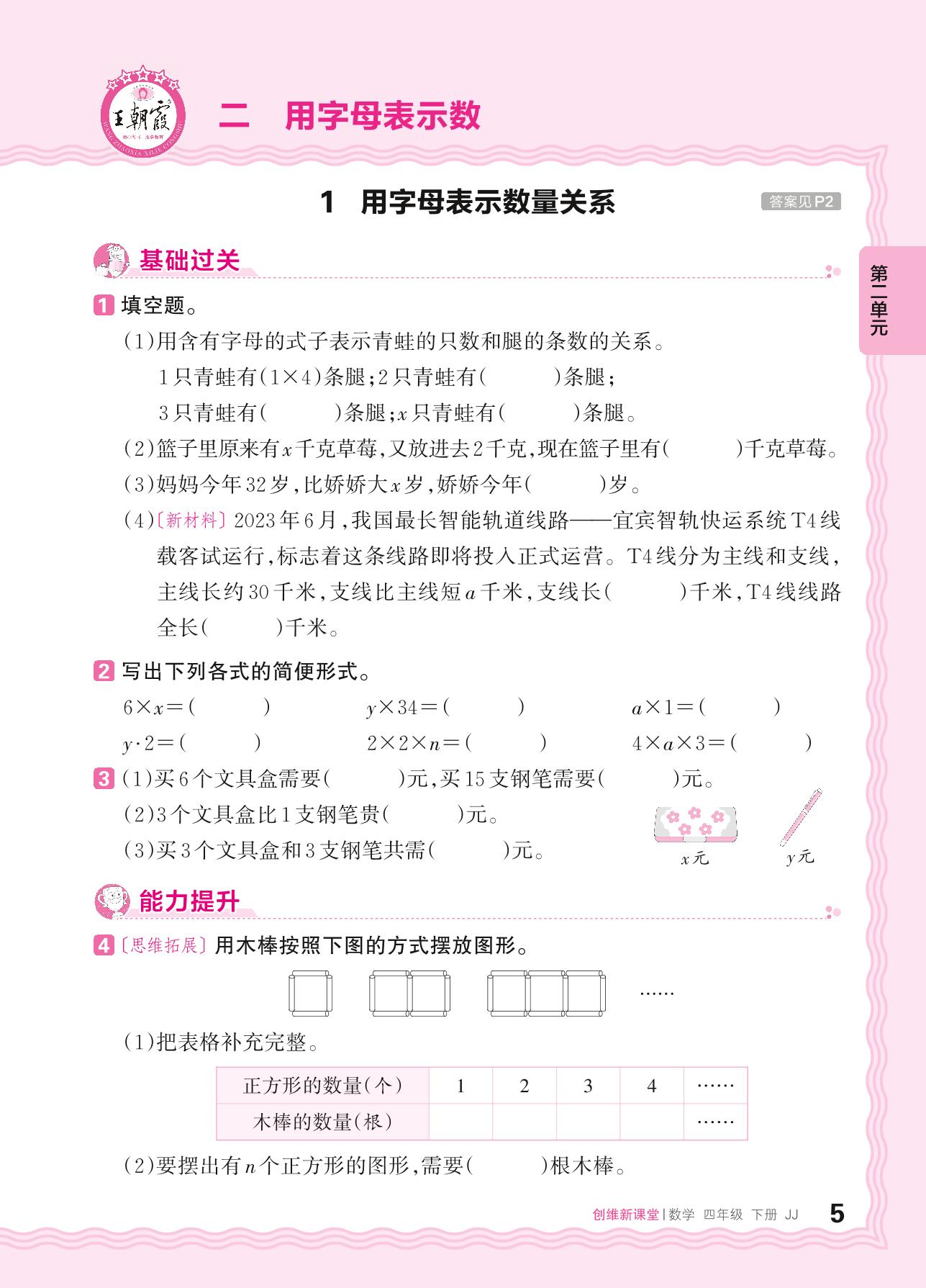 2024春下册四年级数学冀教版 第二单元 用字母表示数——1. 用字母表示数量关系