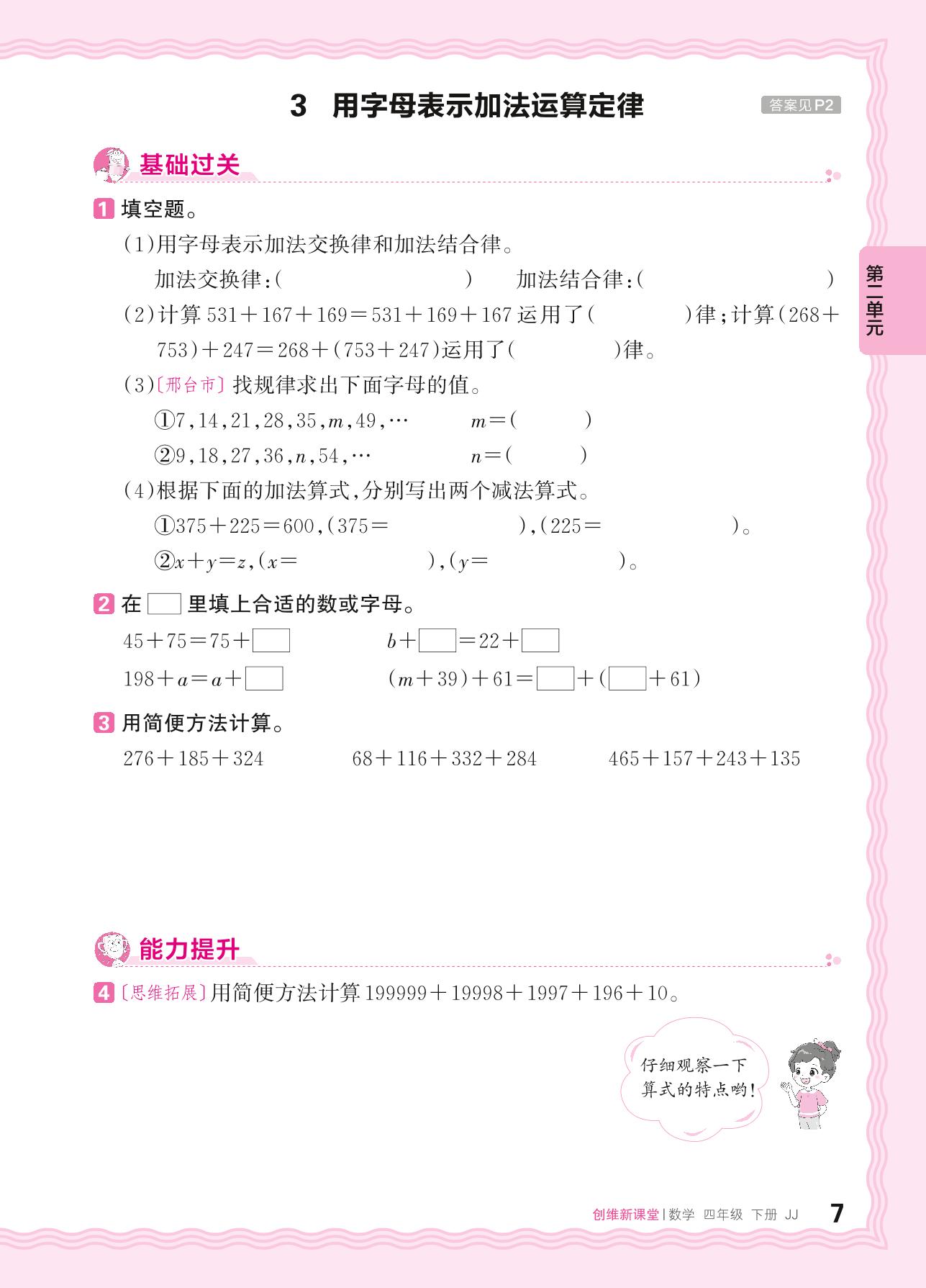 2024春下册四年级数学冀教版 第二单元 用字母表示数——3. 用字母表示加法运算定律