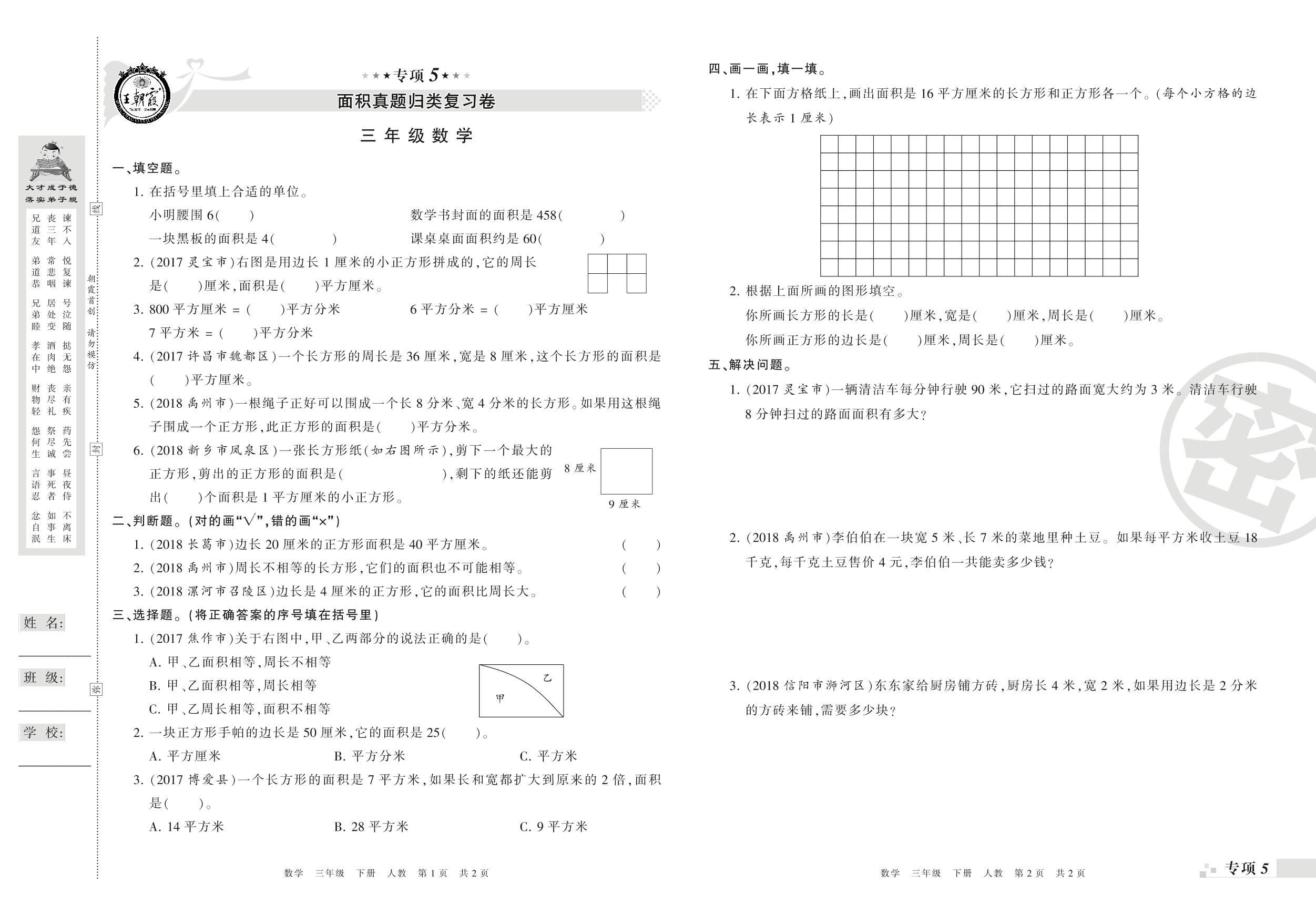 王朝霞期末专项卷——面积 年、月、日真题归类复习卷三年级下册数学(人教版)_R210804101220【0】