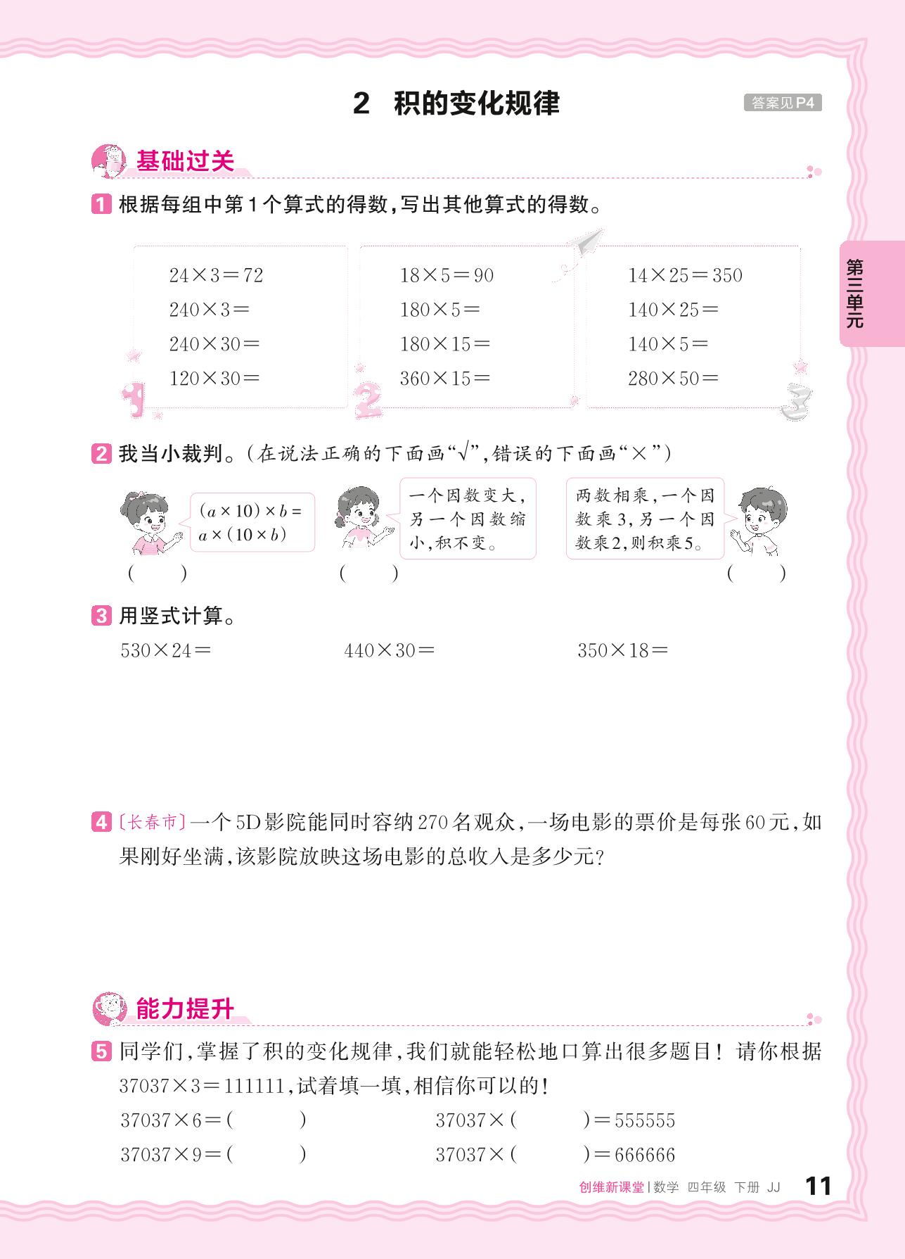 2024春下册四年级数学冀教版 第三单元 三位数乘两位数——2. 积的变化规律