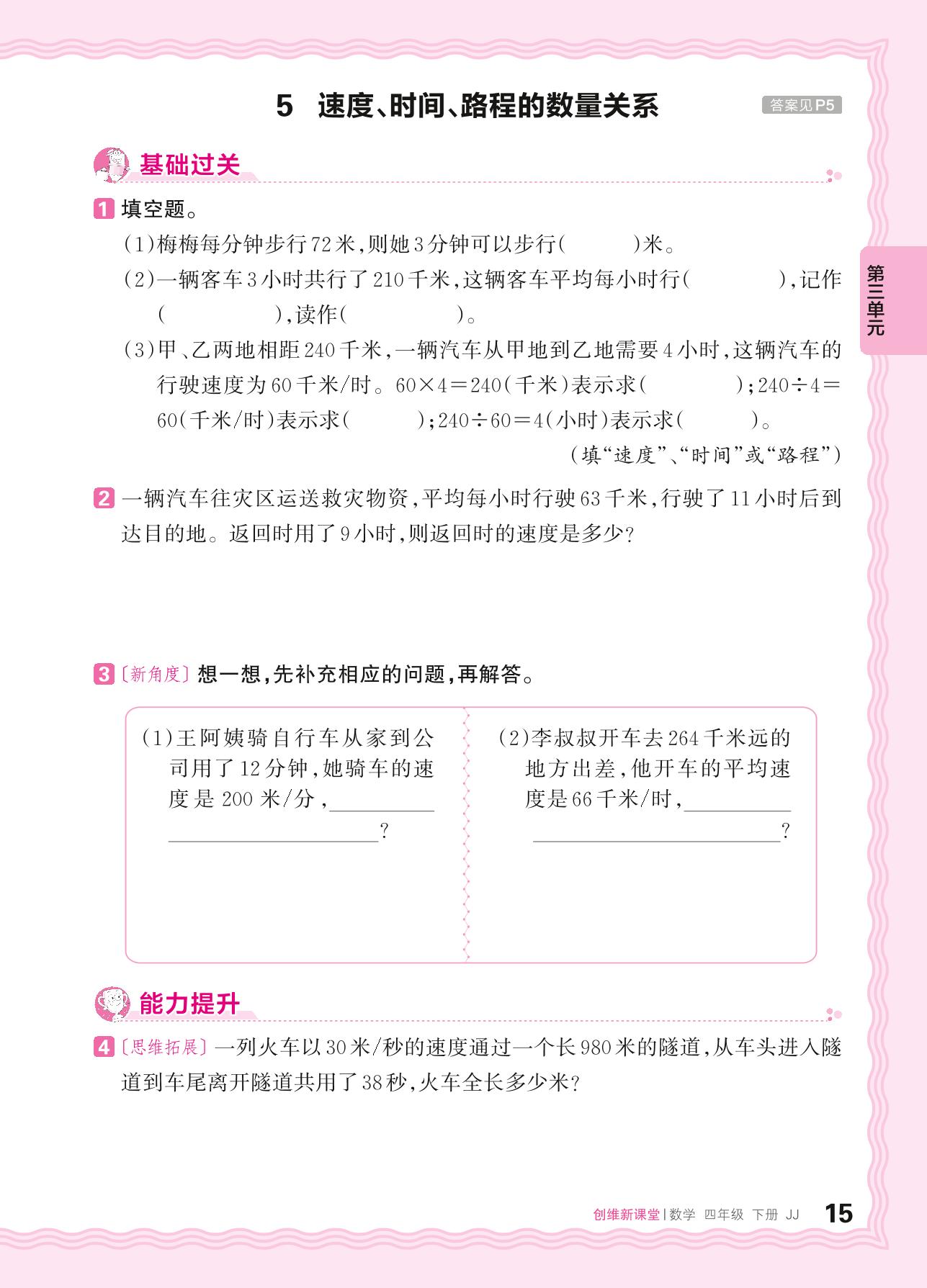2024春下册四年级数学冀教版 第三单元 三位数乘两位数——5. 速度、时间、路程的数量关系