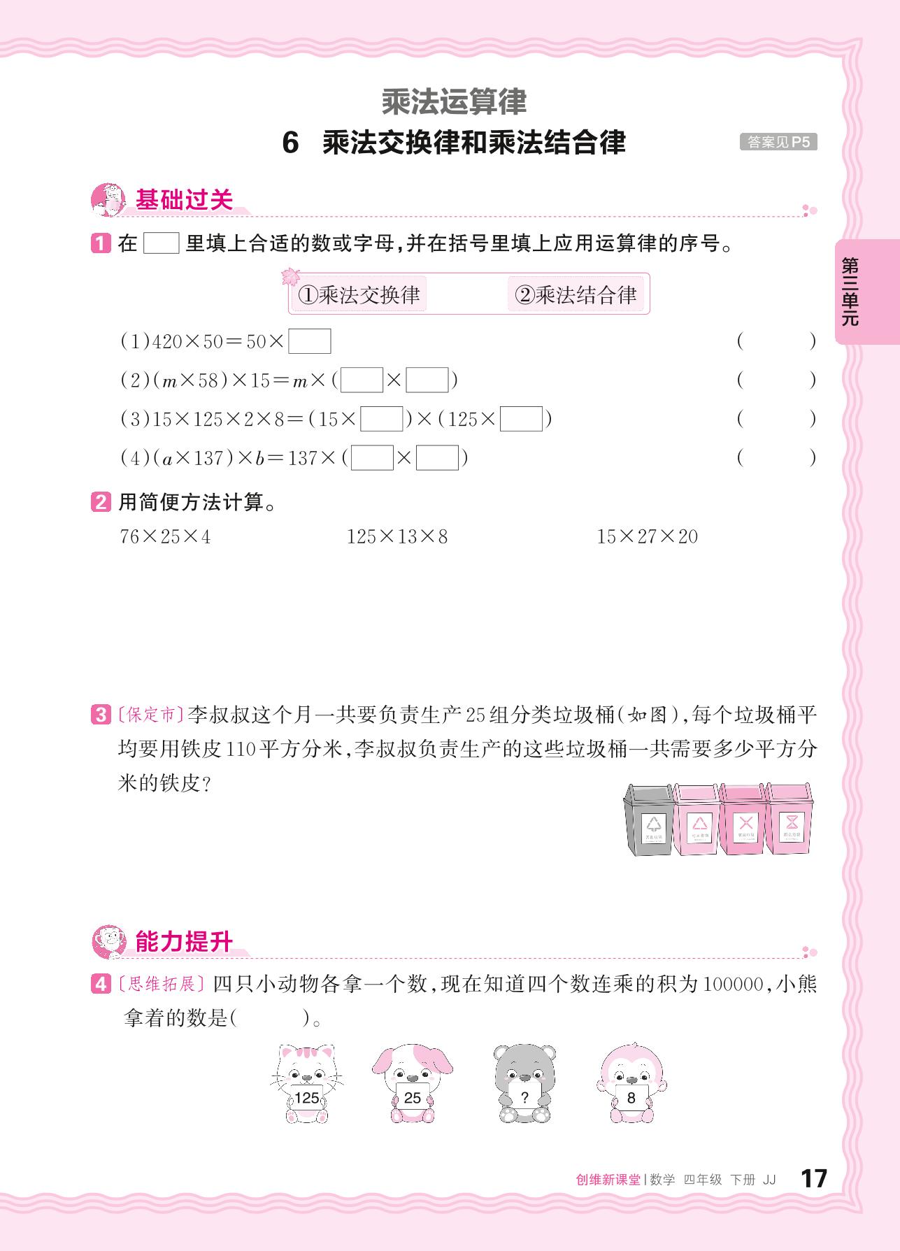 2024春下册四年级数学冀教版 第三单元 三位数乘两位数——6. 乘法交换律和乘法结合律