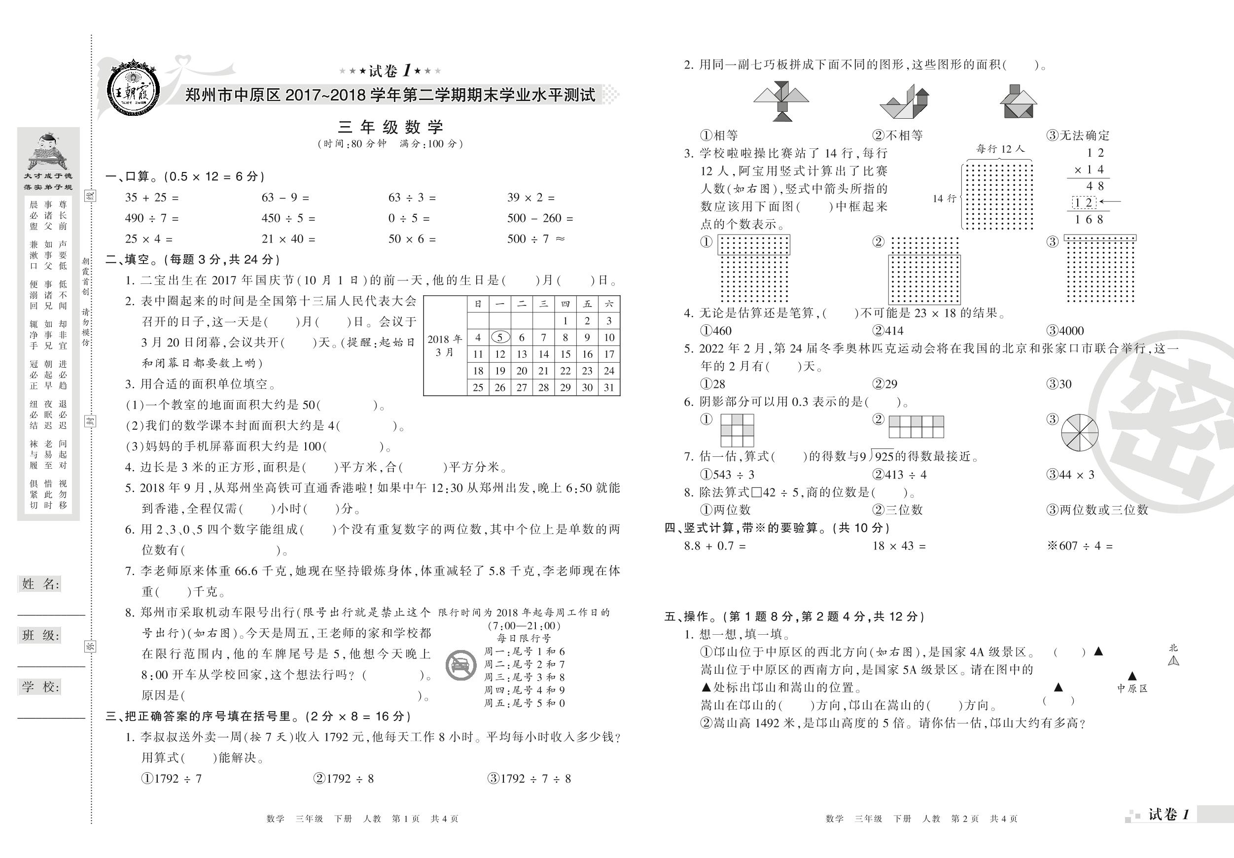 2017-2018学年第二学期郑州市中原区三年级数学试卷(人教版)_R210804101227【1】