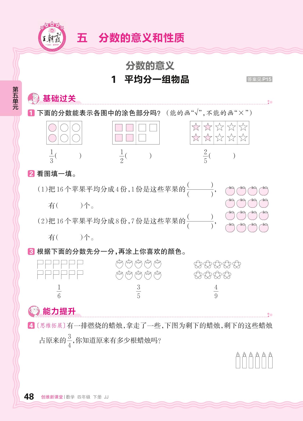2024春下册四年级数学冀教版 第五单元 分数的意义和性质——1. 平均分一组物品