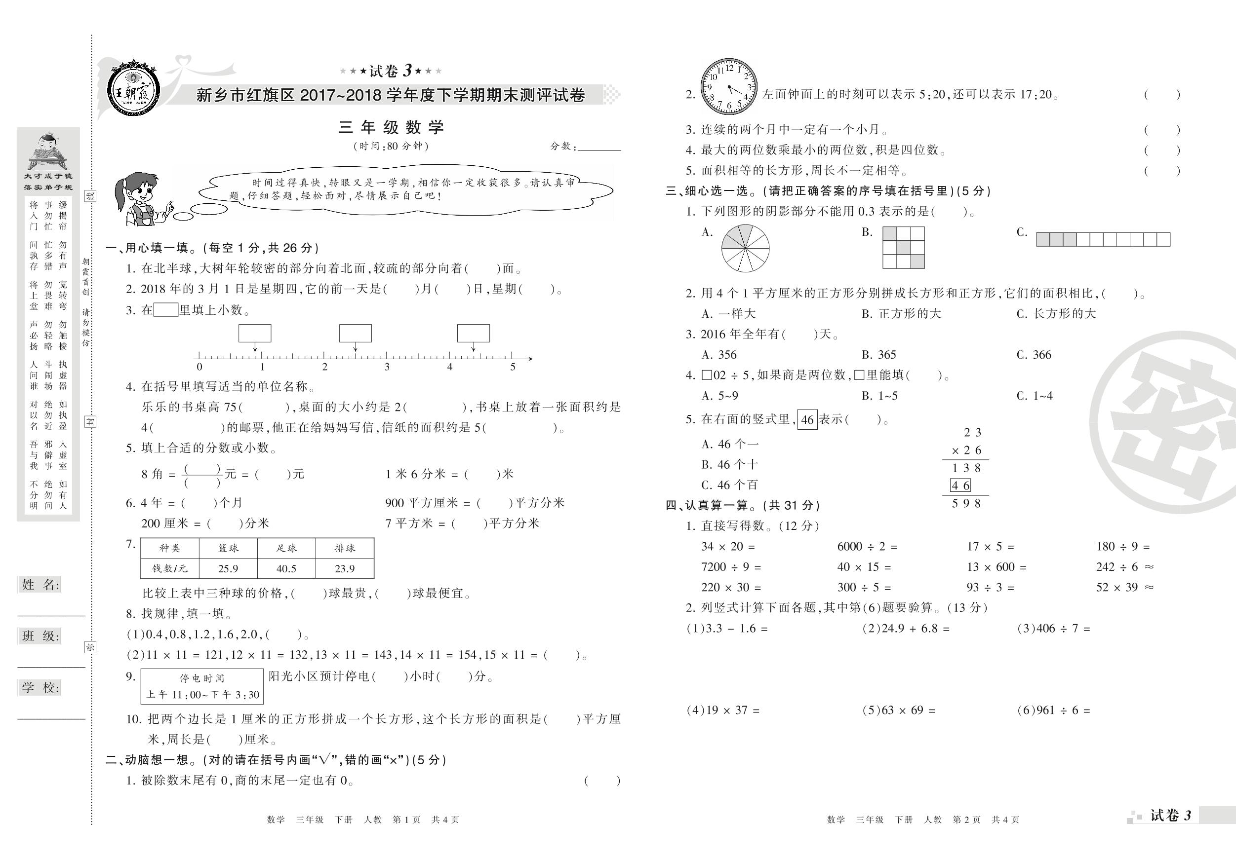 2017-2018学年第二学期新乡市红旗区三年级数学试卷(人教版)【3】