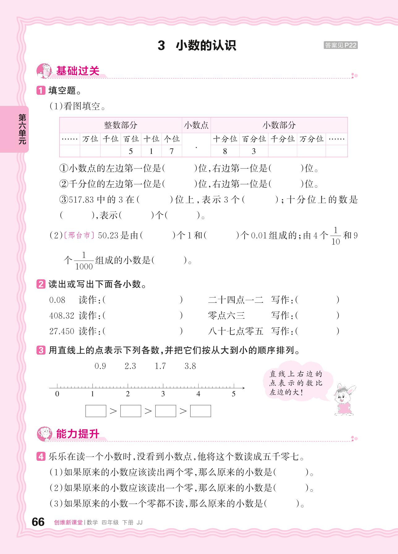 2024春下册四年级数学冀教版 第六单元 小数的认识——3. 小数的认识