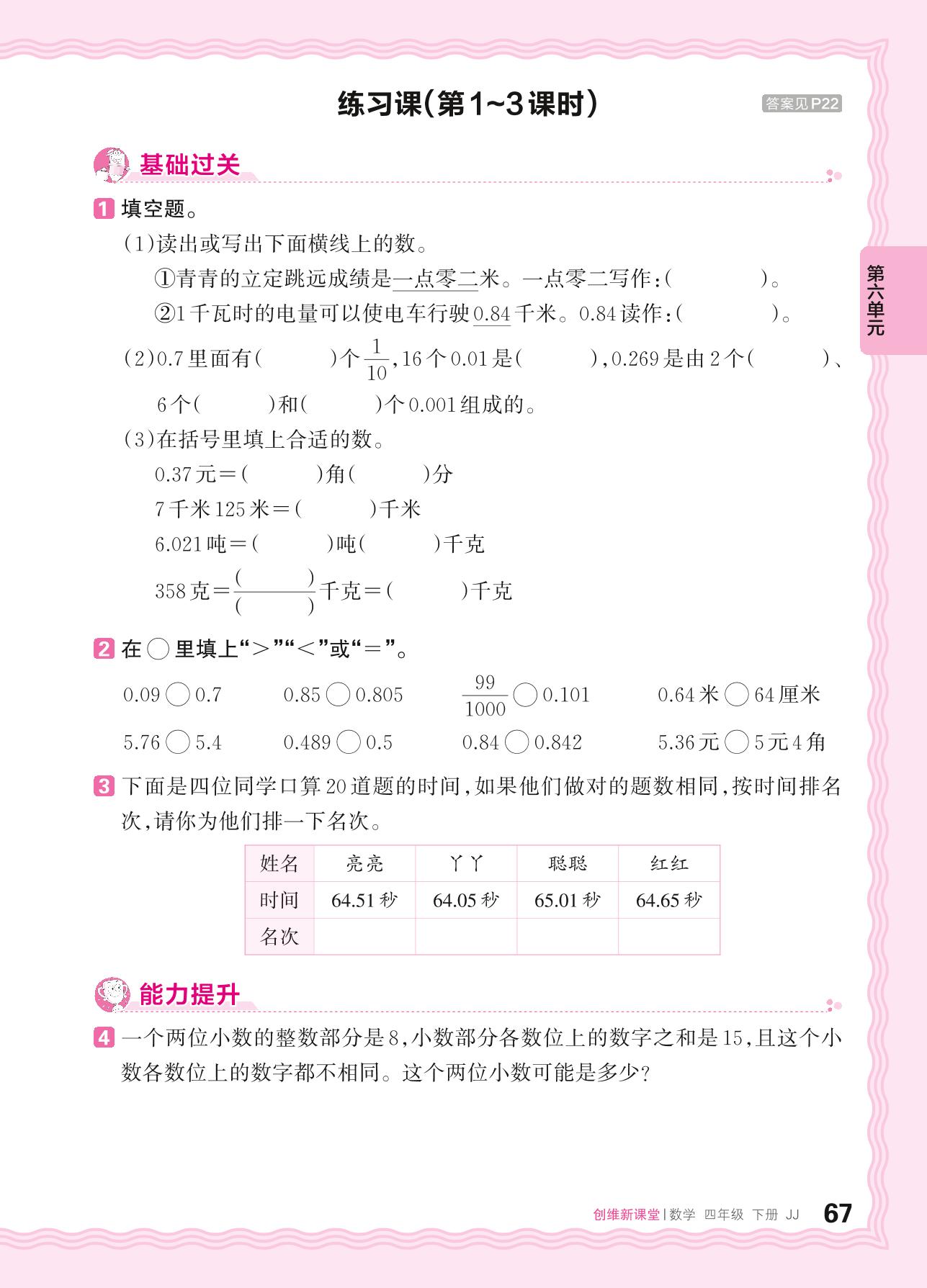 2024春下册四年级数学冀教版 第六单元 小数的认识——小数的意义、小数和分数的关系、小数的认识练习课