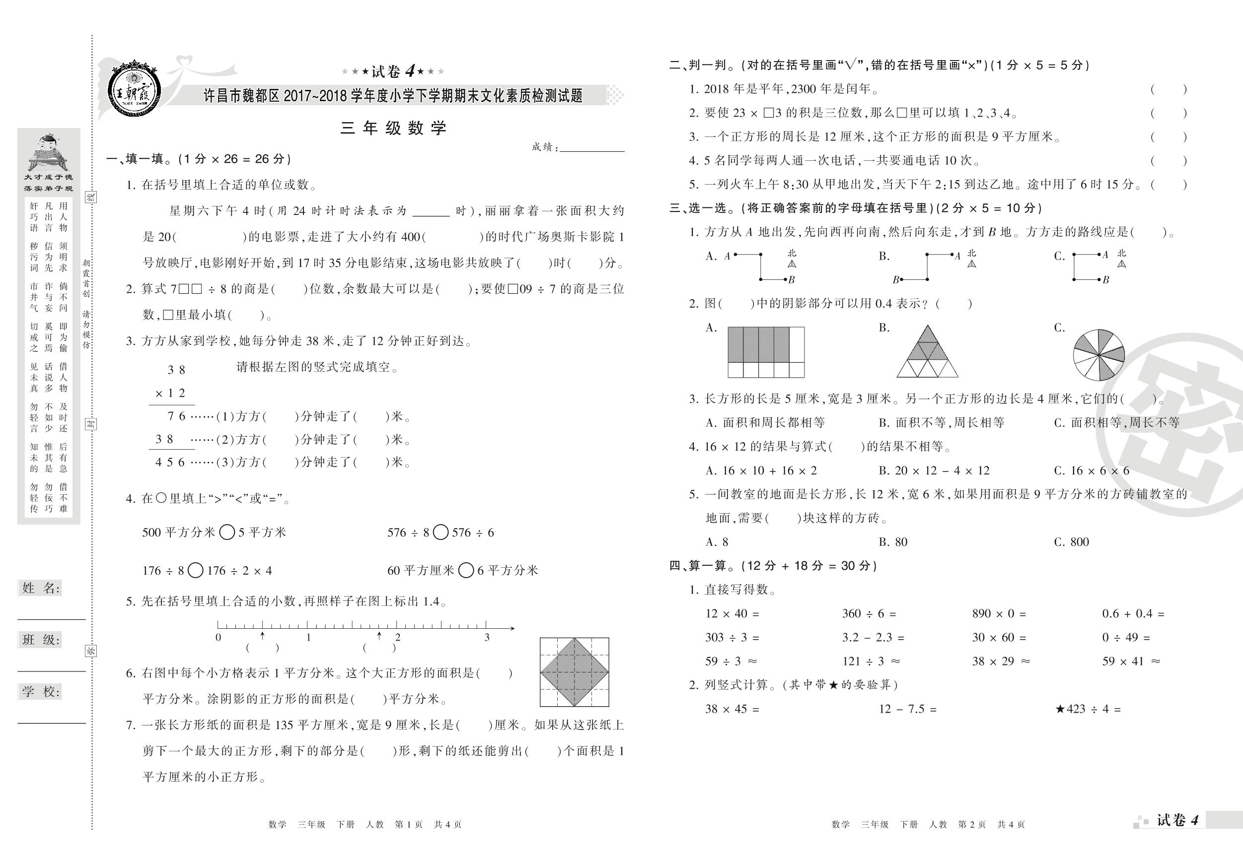 2017-2018学年第二学期许昌市魏都区三年级数学试卷(人教版)【4】