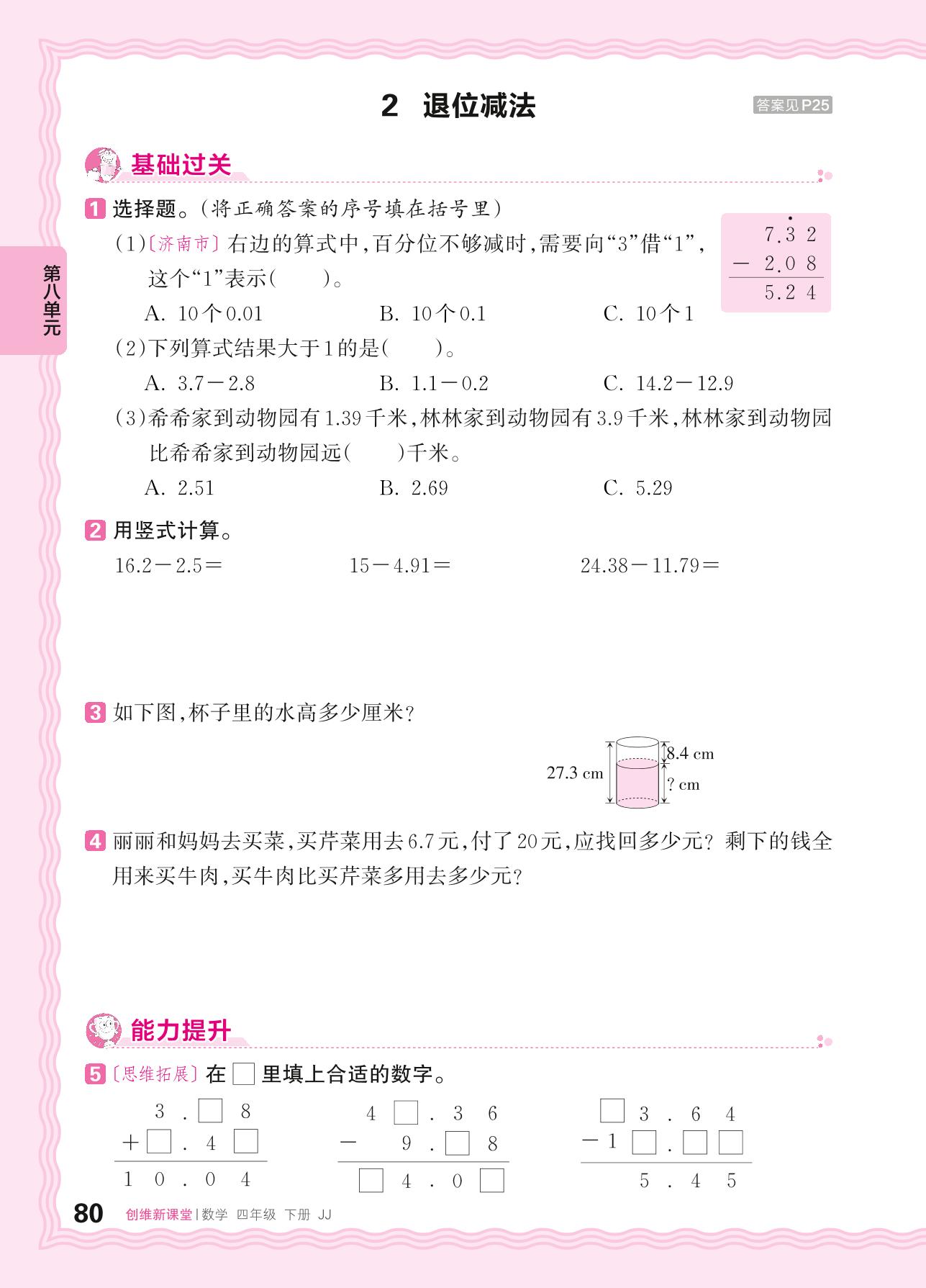 2024春下册四年级数学冀教版 第八单元 小数加法和减法——2. 退位减法