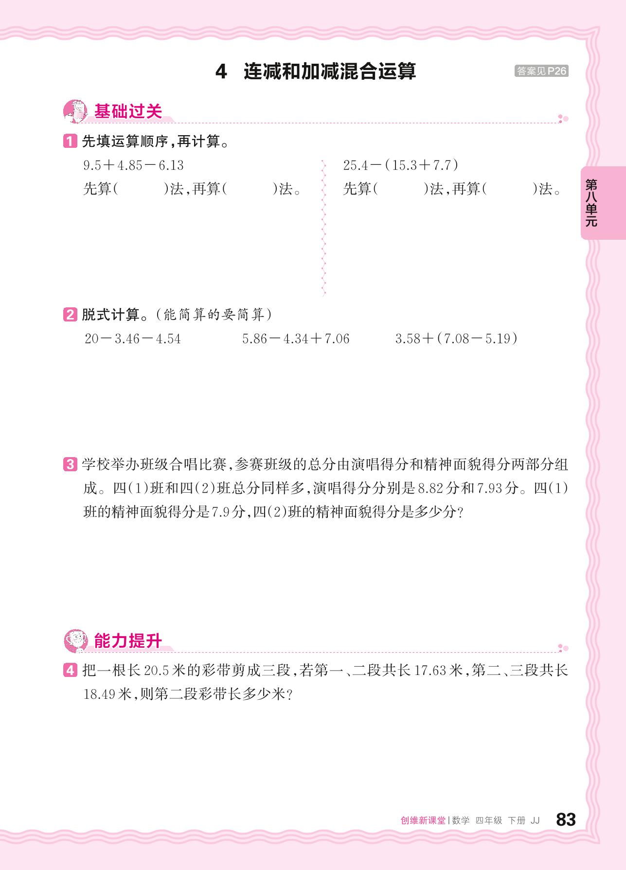 2024春下册四年级数学冀教版 第八单元 小数加法和减法——4. 连减和加减混合运算