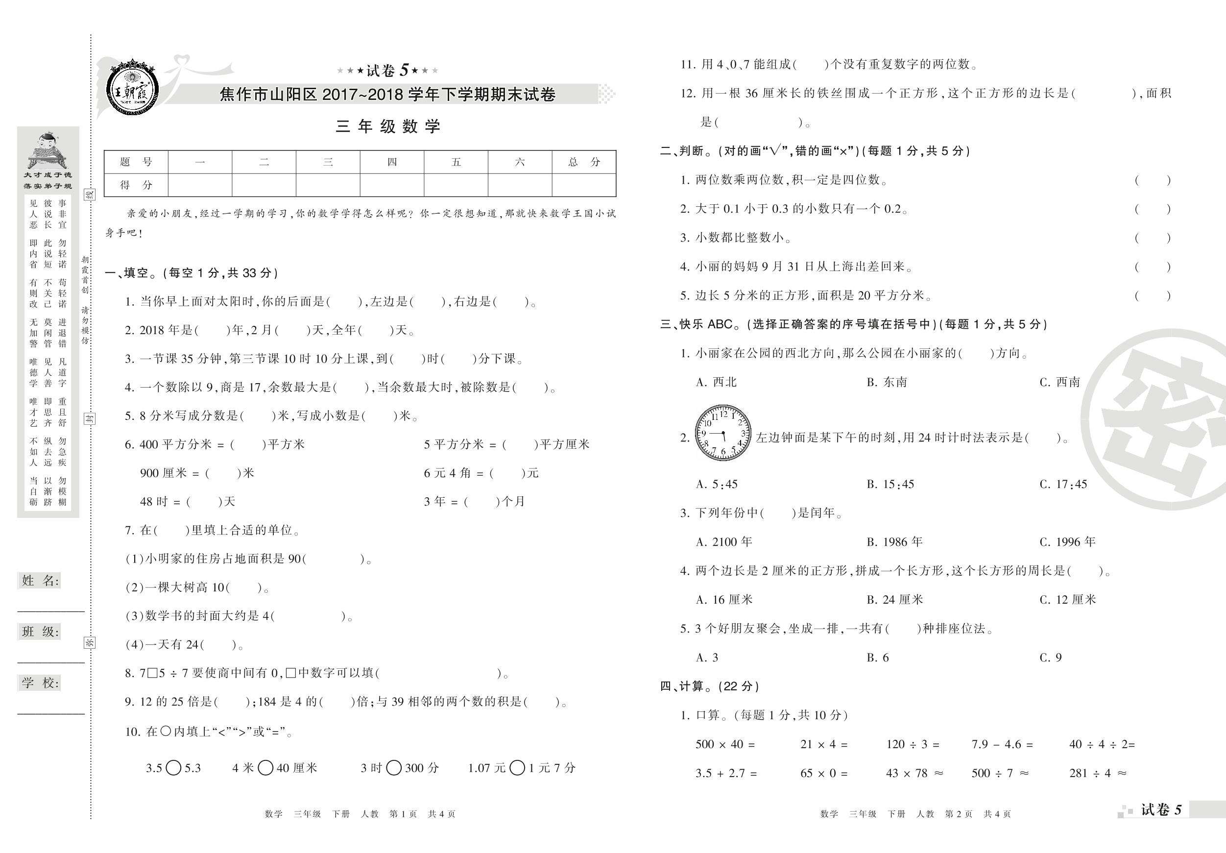 2017-2018学年第二学期焦作市山阳区三年级数学试卷(人教版)【5】