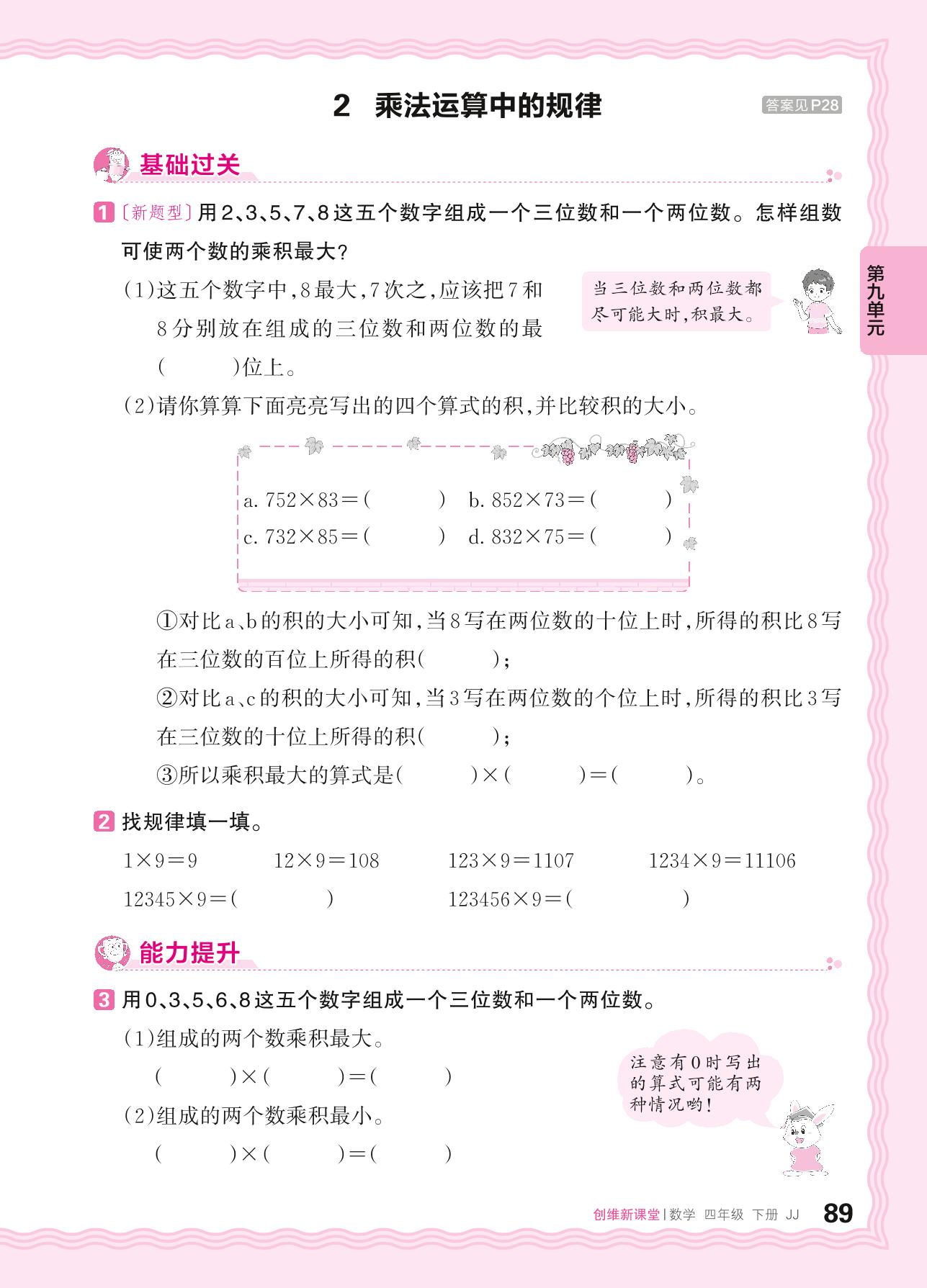 2024春下册四年级数学冀教版 第九单元 探索乐园——2. 乘法运算中的规律