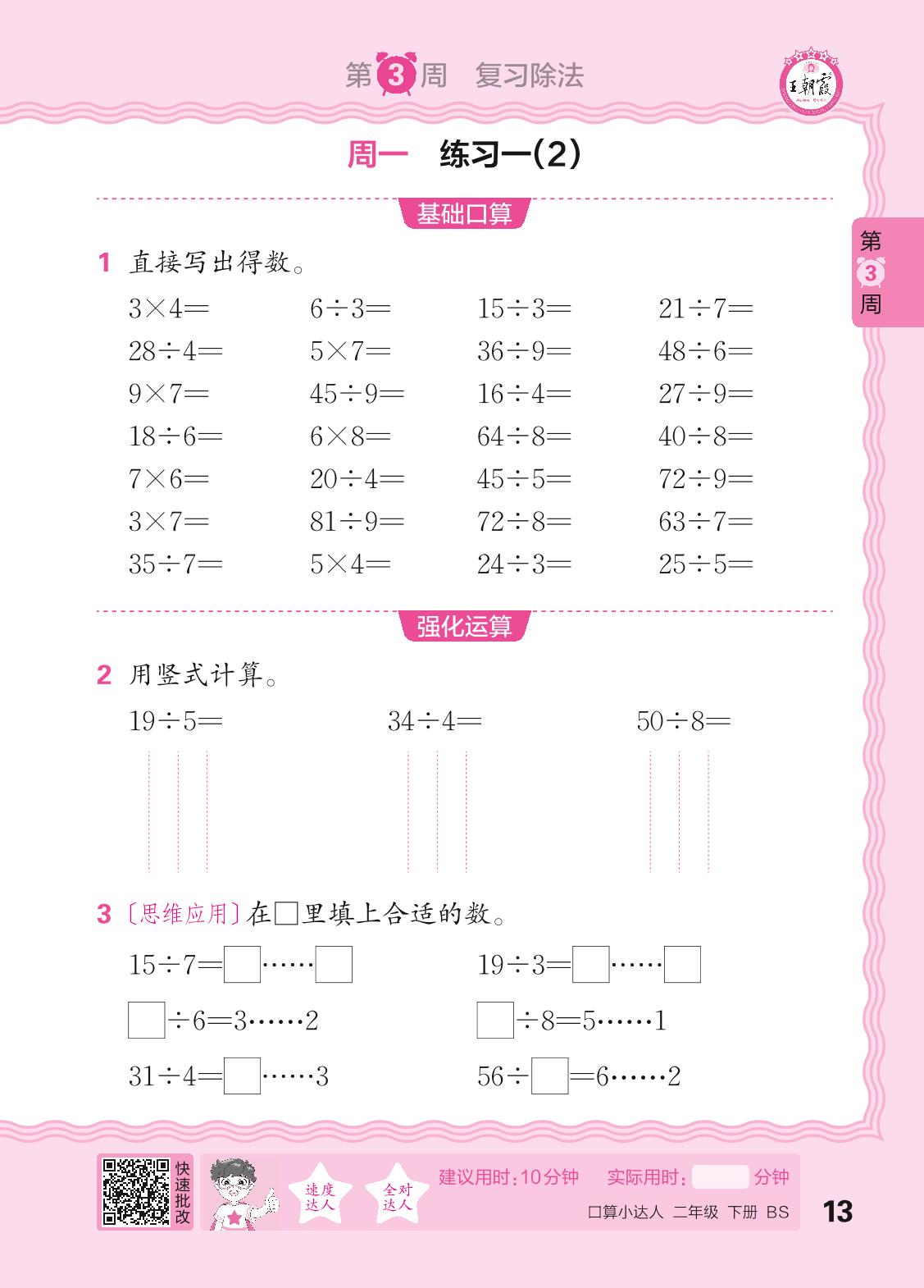 2024春下册二年级数学北师版 口算计算专练 第3周