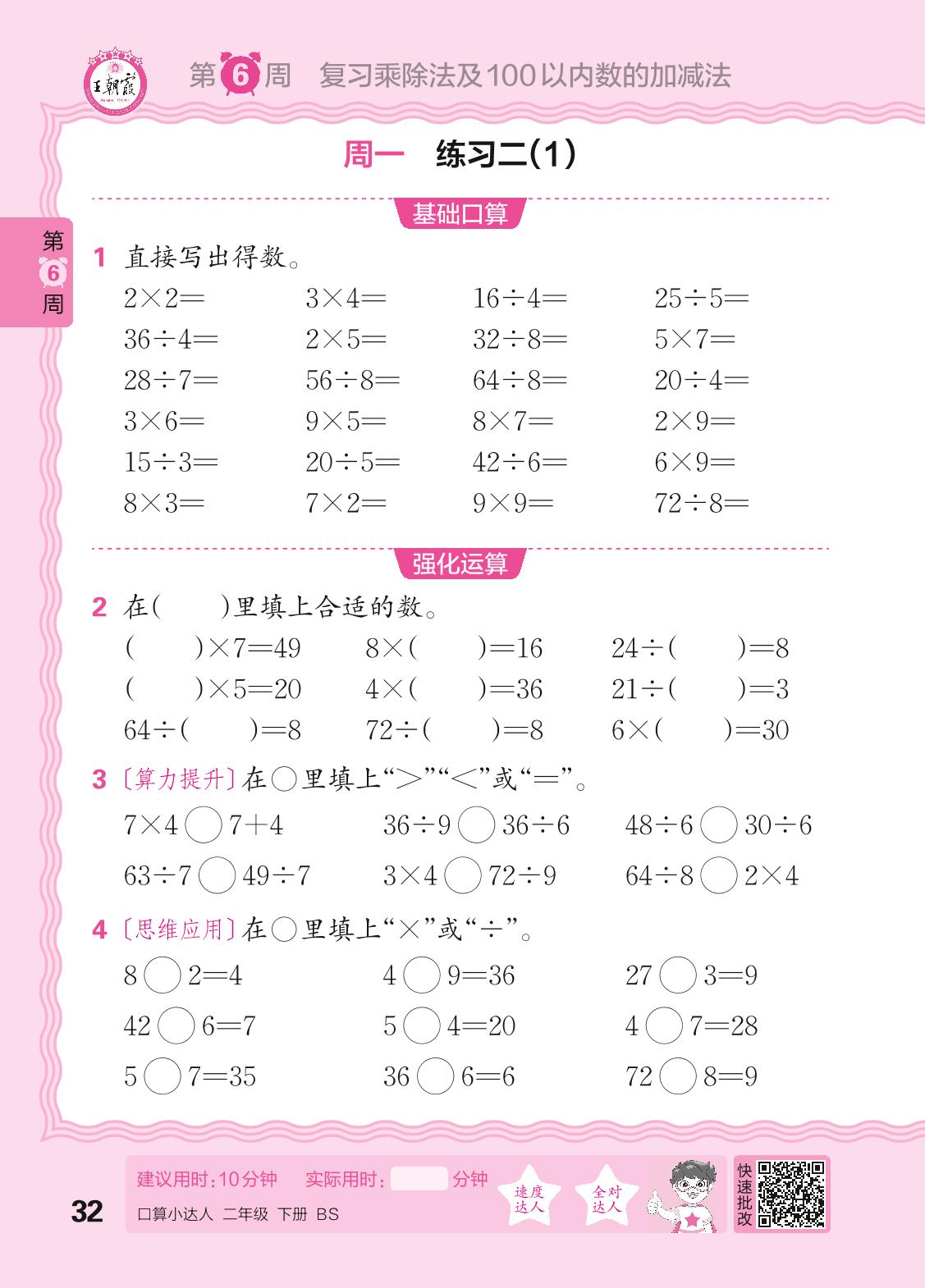 2024春下册二年级数学北师版 口算计算专练 第6周