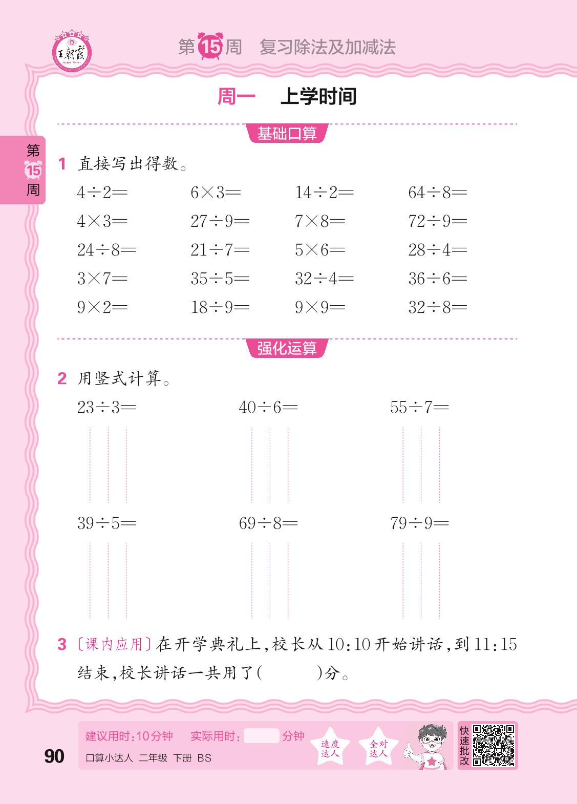 2024春下册二年级数学北师版 口算计算专练 第15周