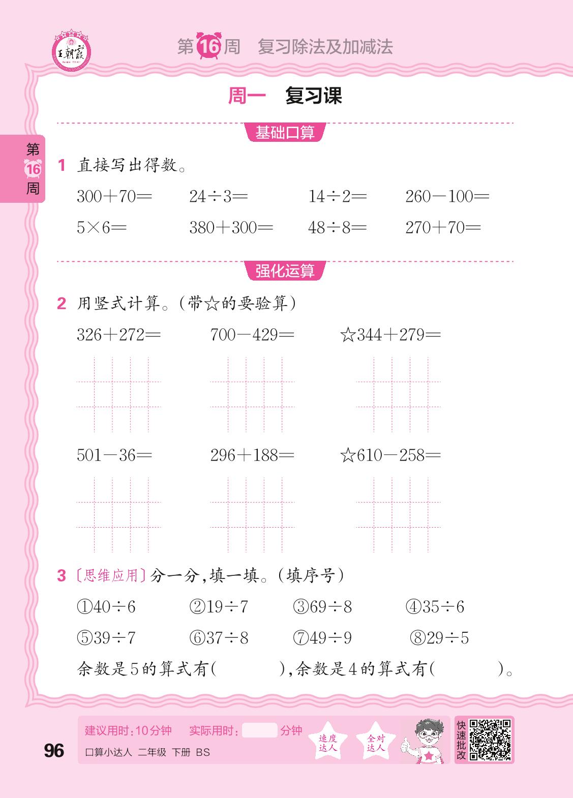 2024春下册二年级数学北师版 口算计算专练 第16周