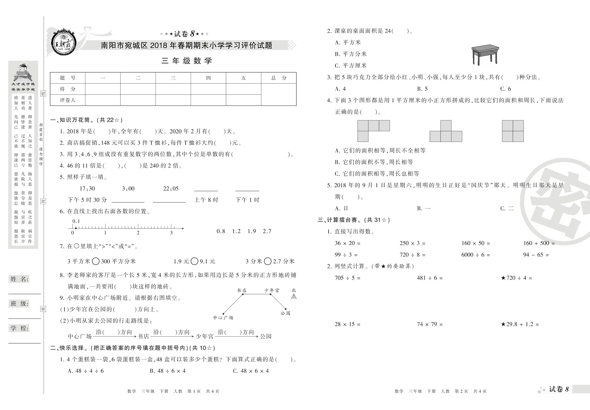 2017-2018学年第二学期南阳市宛城区三年级数学试卷(人教版)【8】