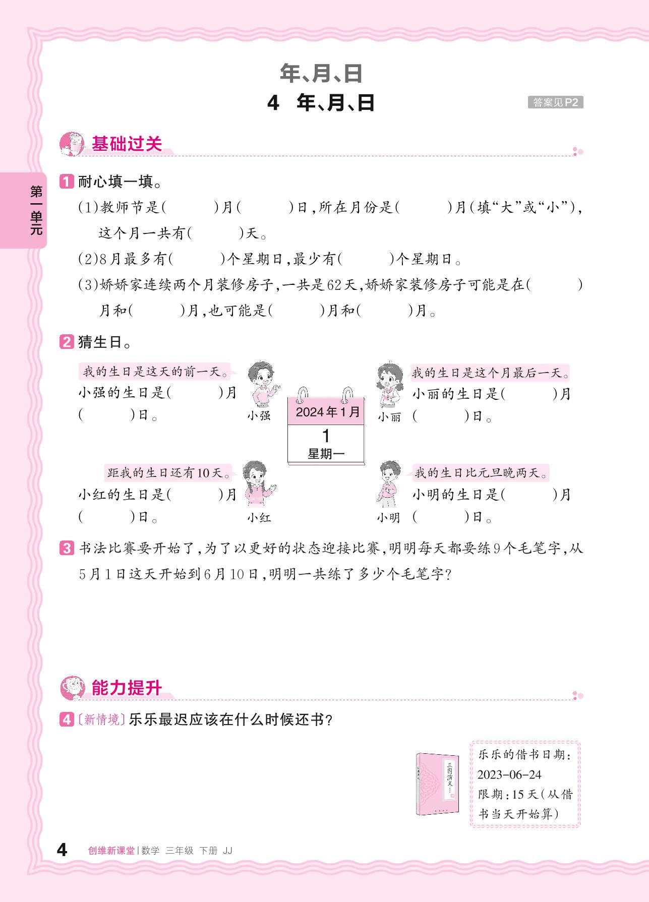 2024春下册三年级数学冀教版 第一单元 年、月、日——4. 年、月、日
