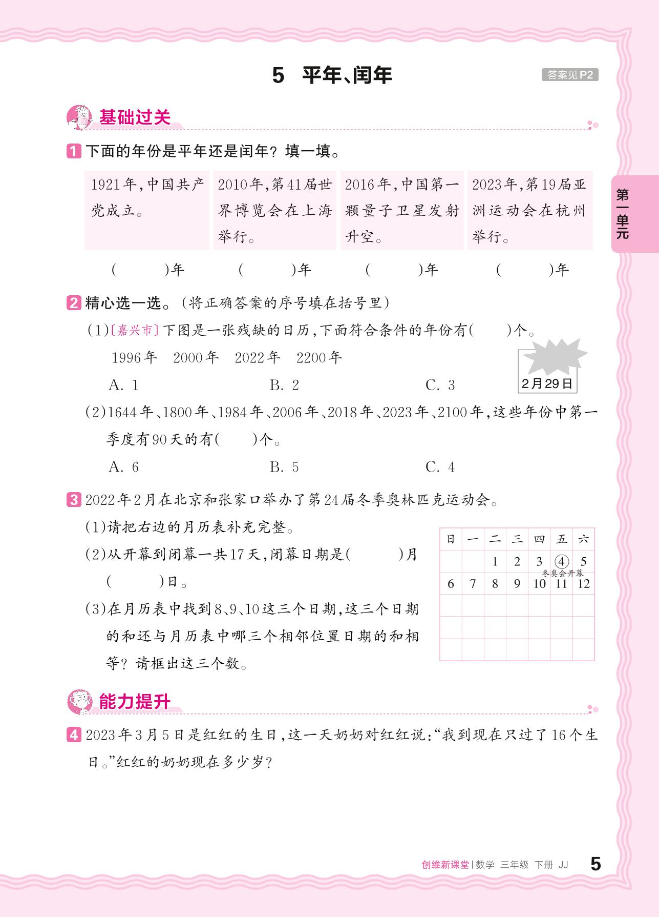 2024春下册三年级数学冀教版 第一单元 年、月、日——5. 平年、闰年