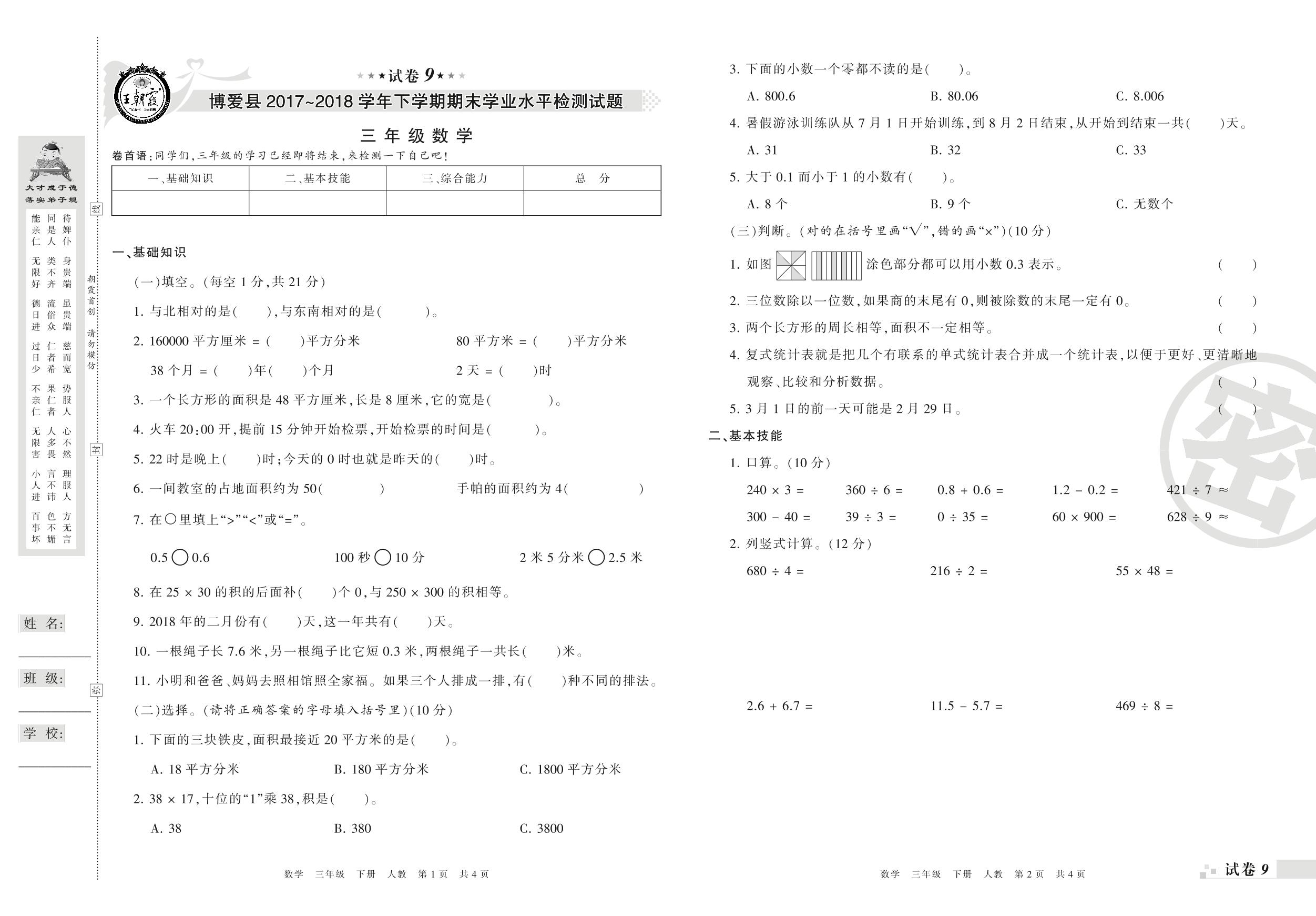 2017-2018学年第二学期焦作市博爱县三年级数学试卷(人教版)【9】