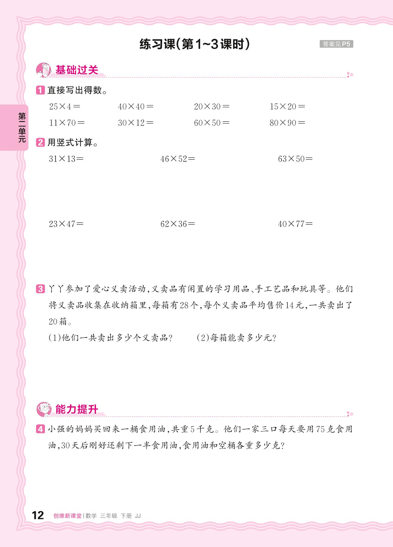 2024春下册三年级数学冀教版 第二单元 两位数乘两位数——两位数乘两位数(不进位)的乘法、两位数乘两位数(进位)的乘法、乘数末尾有0的乘法练习课