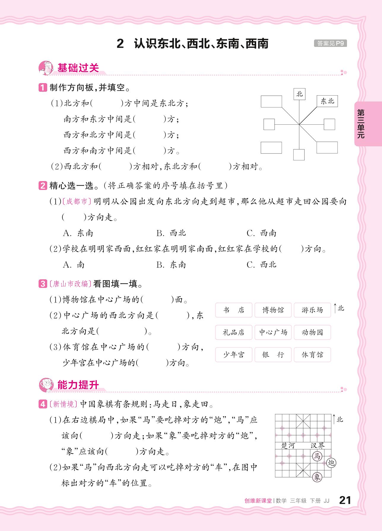 2024春下册三年级数学冀教版 第三单元 辨认方向——2. 认识东北、西北、东南、西南