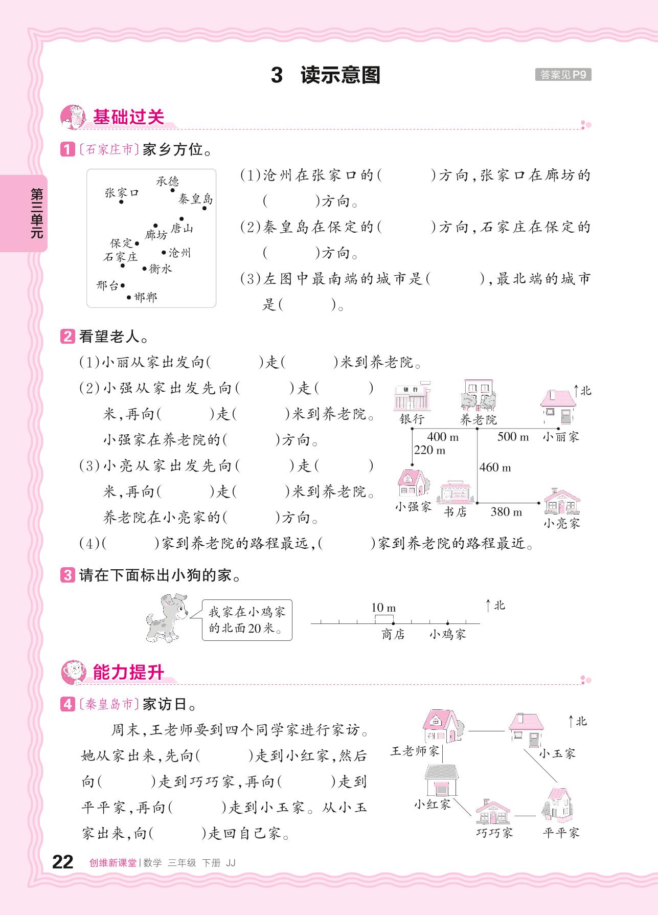 2024春下册三年级数学冀教版 第三单元 辨认方向——3. 读示意图