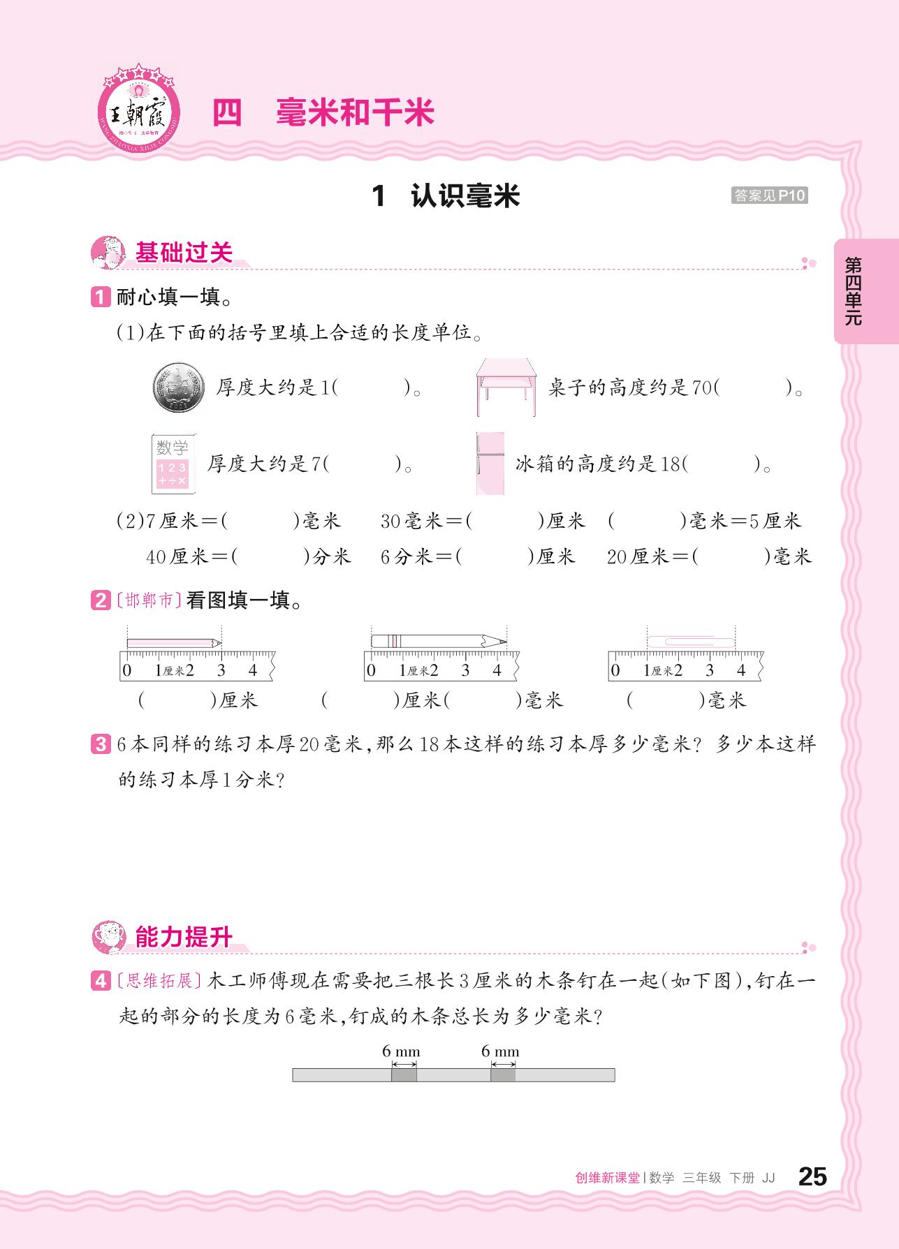 2024春下册三年级数学冀教版 第四单元 毫米和千米——1. 认识毫米