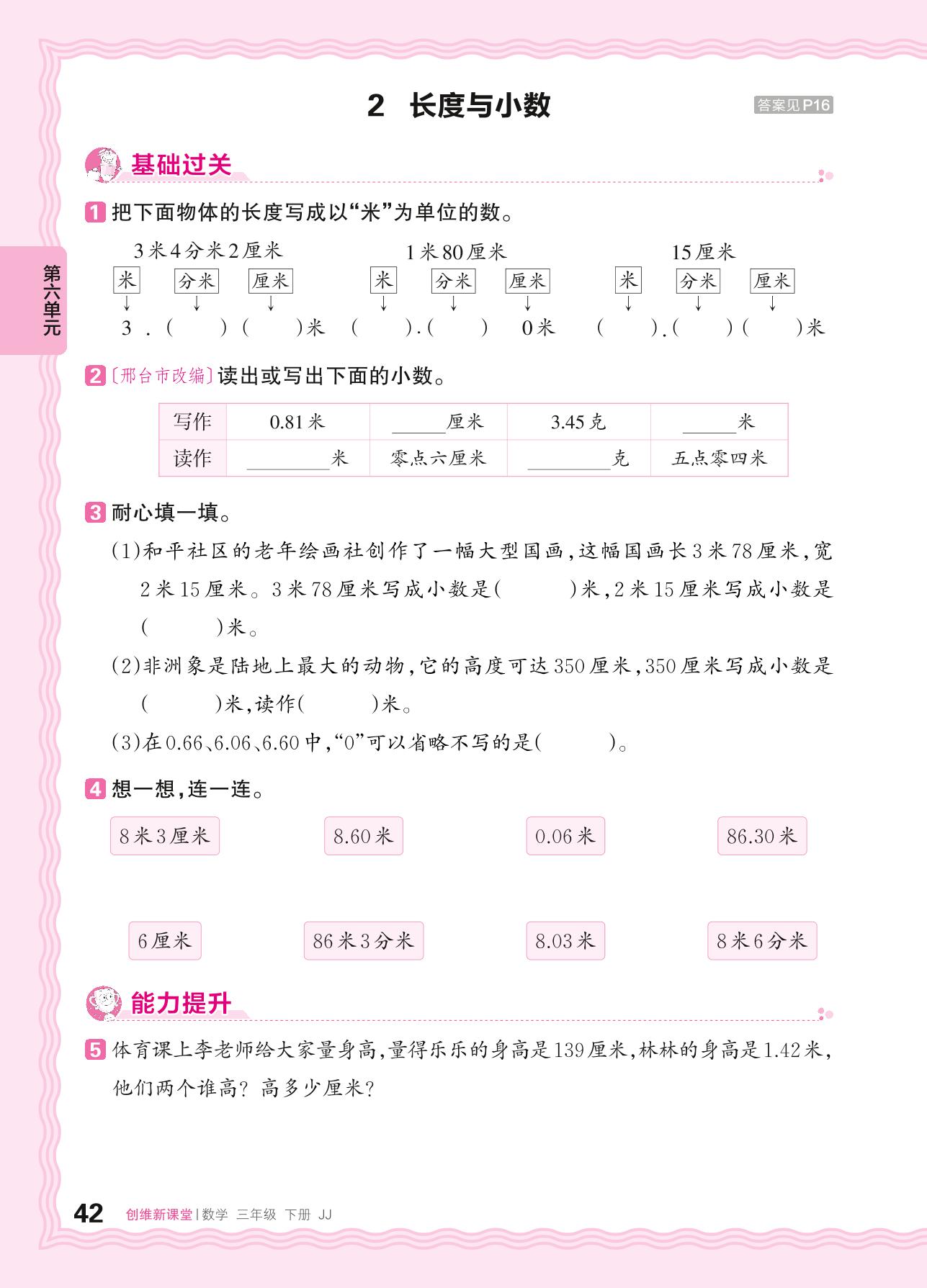 2024春下册三年级数学冀教版 第六单元 小数的初步认识——2. 长度与小数