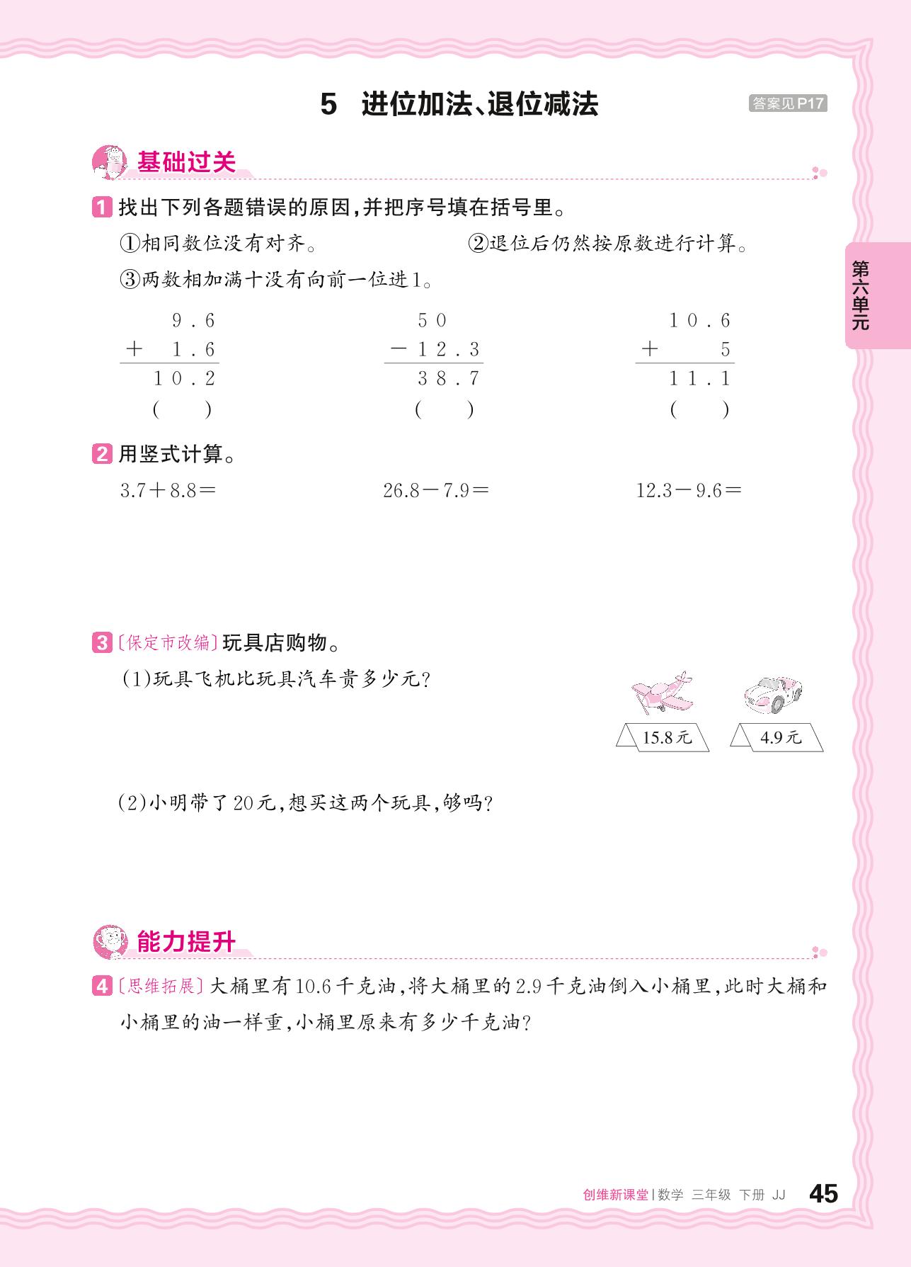 2024春下册三年级数学冀教版 第六单元 小数的初步认识——5. 进位加法、退位减法
