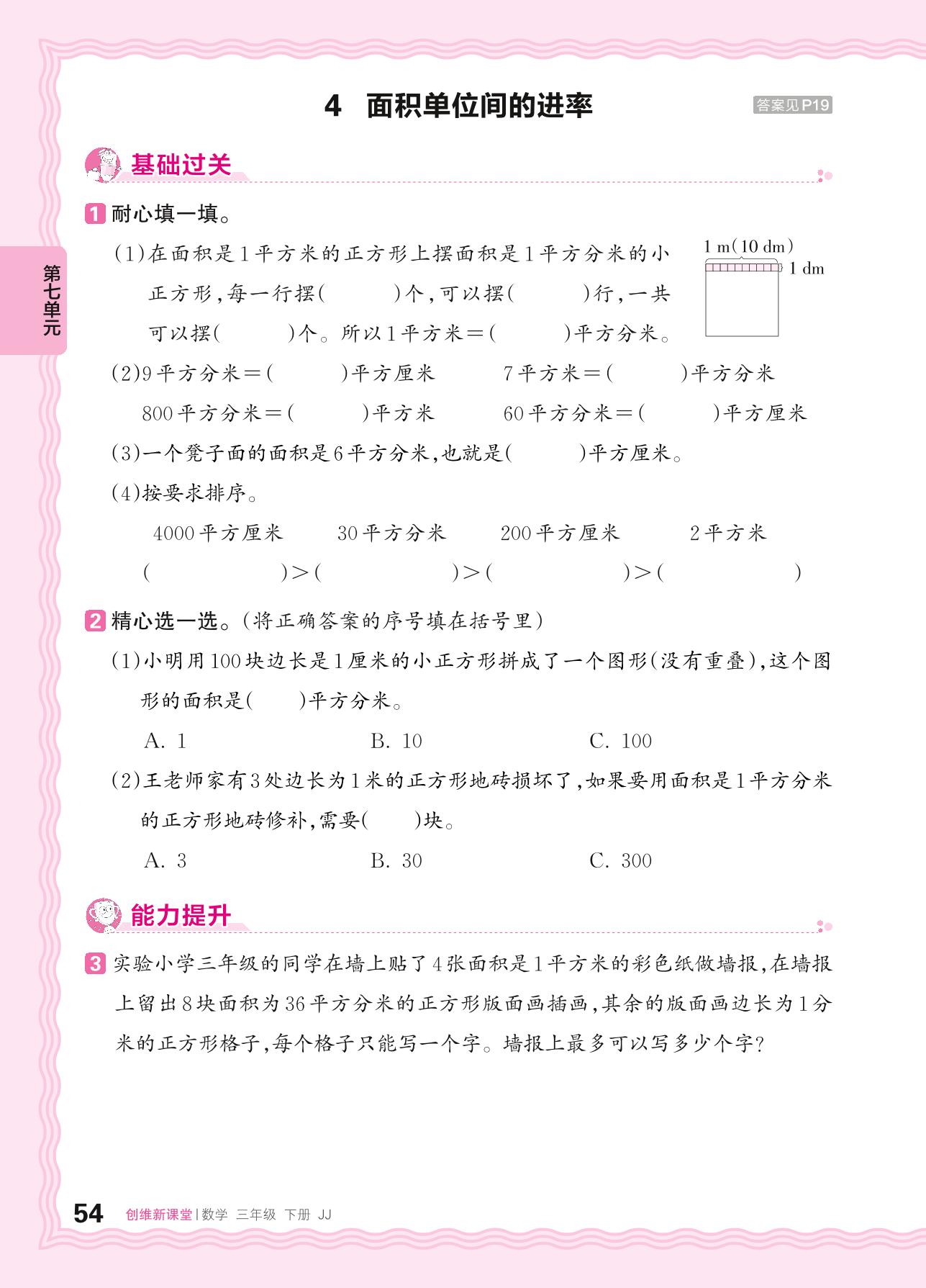 2024春下册三年级数学冀教版 第七单元 长方形和正方形的面积——4. 面积单位间的进率