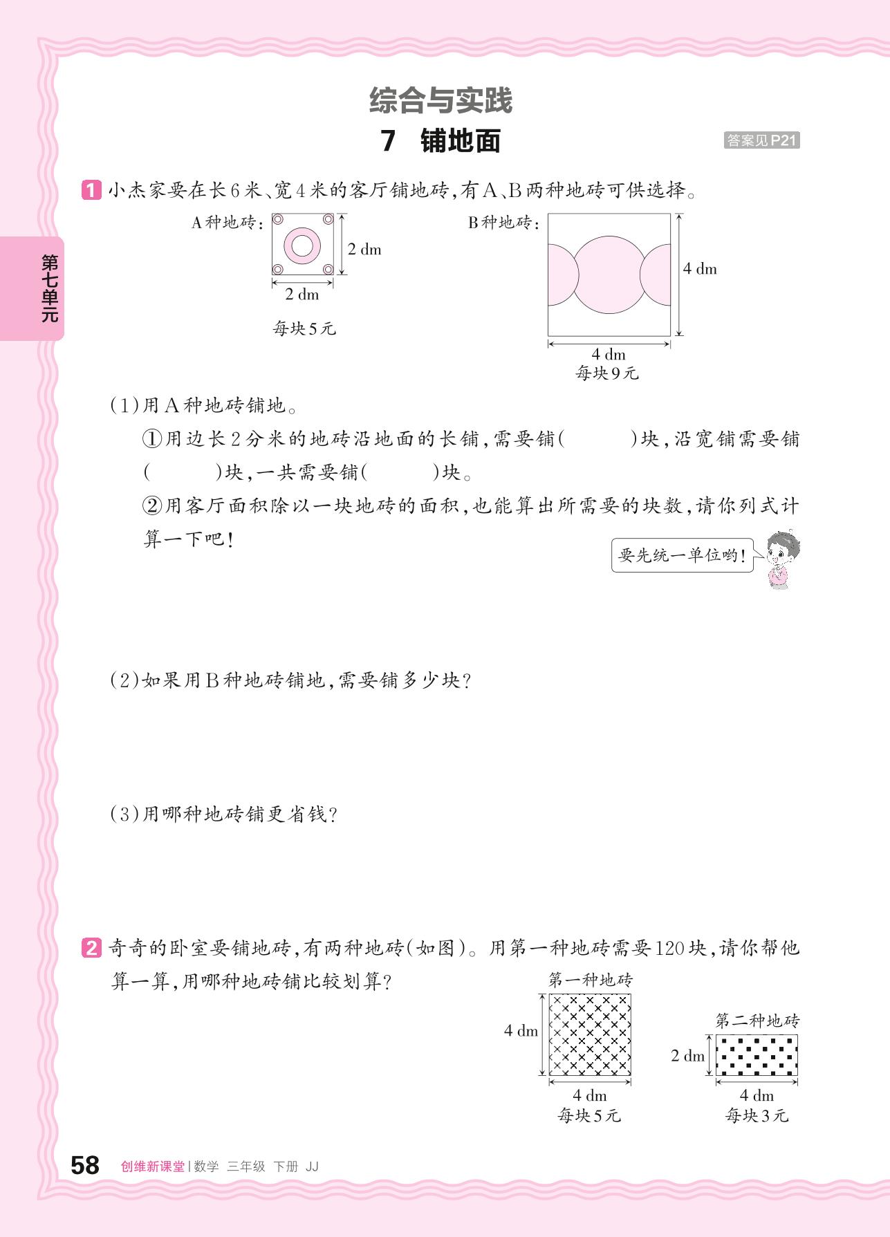 2024春下册三年级数学冀教版 第七单元 长方形和正方形的面积——7. 铺地面