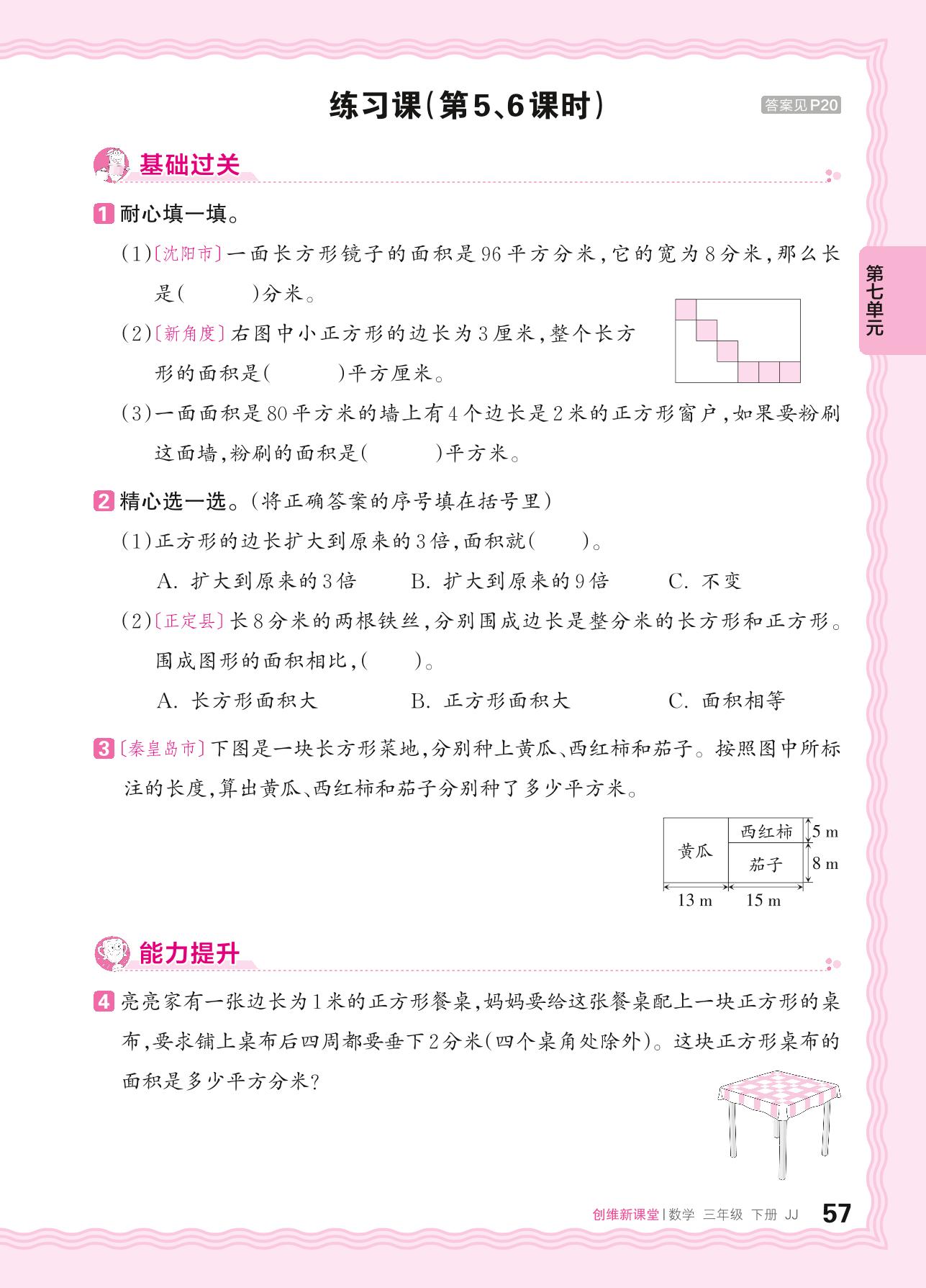 2024春下册三年级数学冀教版 第七单元 长方形和正方形的面积——长方形的面积、正方形的面积练习课