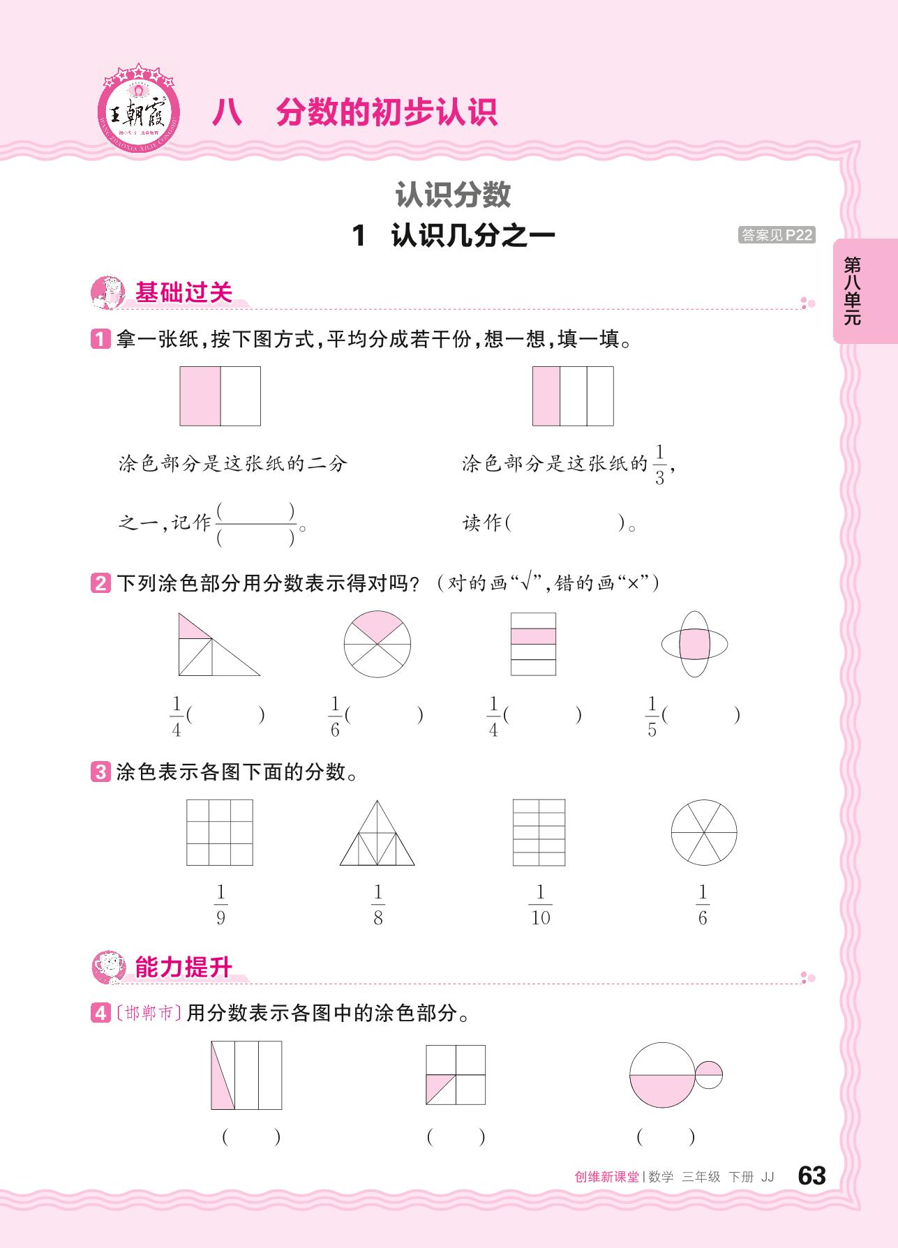2024春下册三年级数学冀教版 第八单元 分数的初步认识——1. 认识几分之一