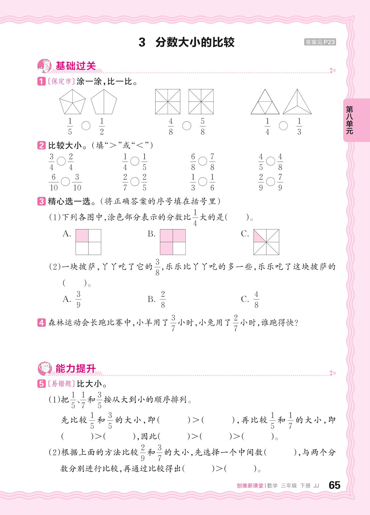 2024春下册三年级数学冀教版 第八单元 分数的初步认识——3. 分数大小的比较
