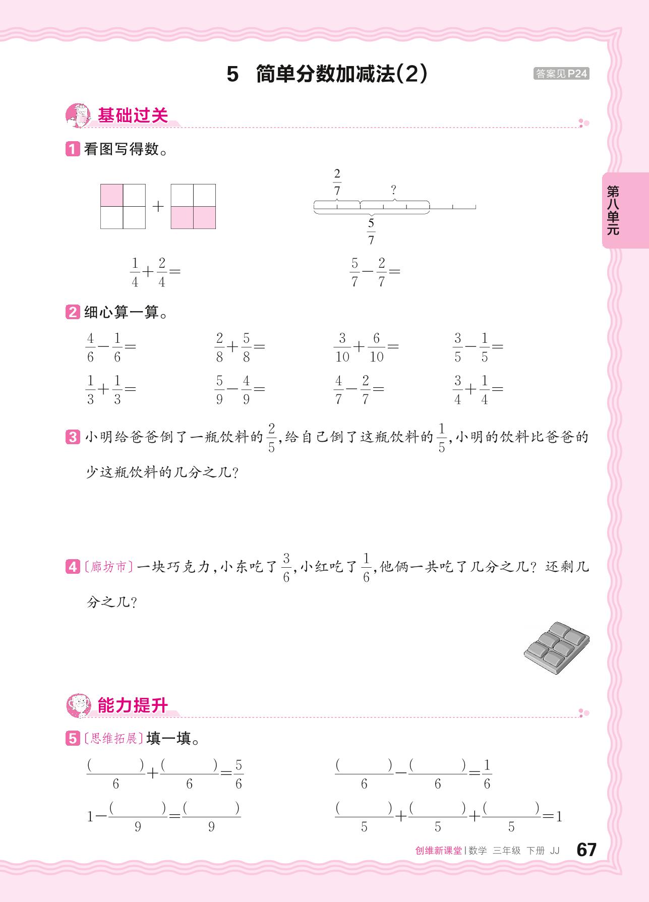 2024春下册三年级数学冀教版 第八单元 分数的初步认识——5. 简单分数加减法(2)