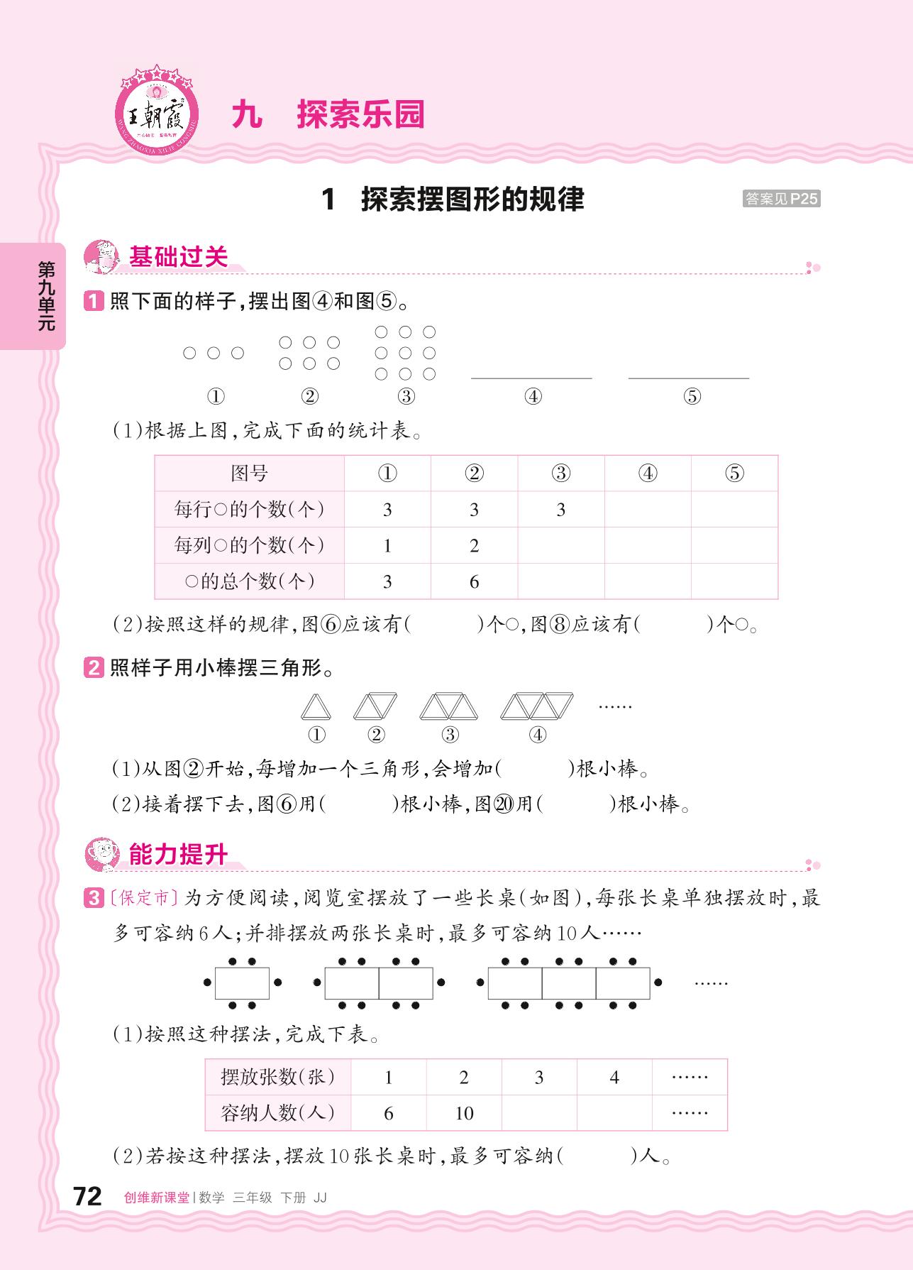 2024春下册三年级数学冀教版 第九单元 探索乐园——1. 探索摆图形的规律