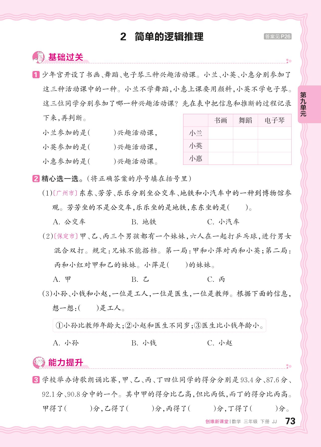 2024春下册三年级数学冀教版 第九单元 探索乐园——2. 简单的逻辑推理