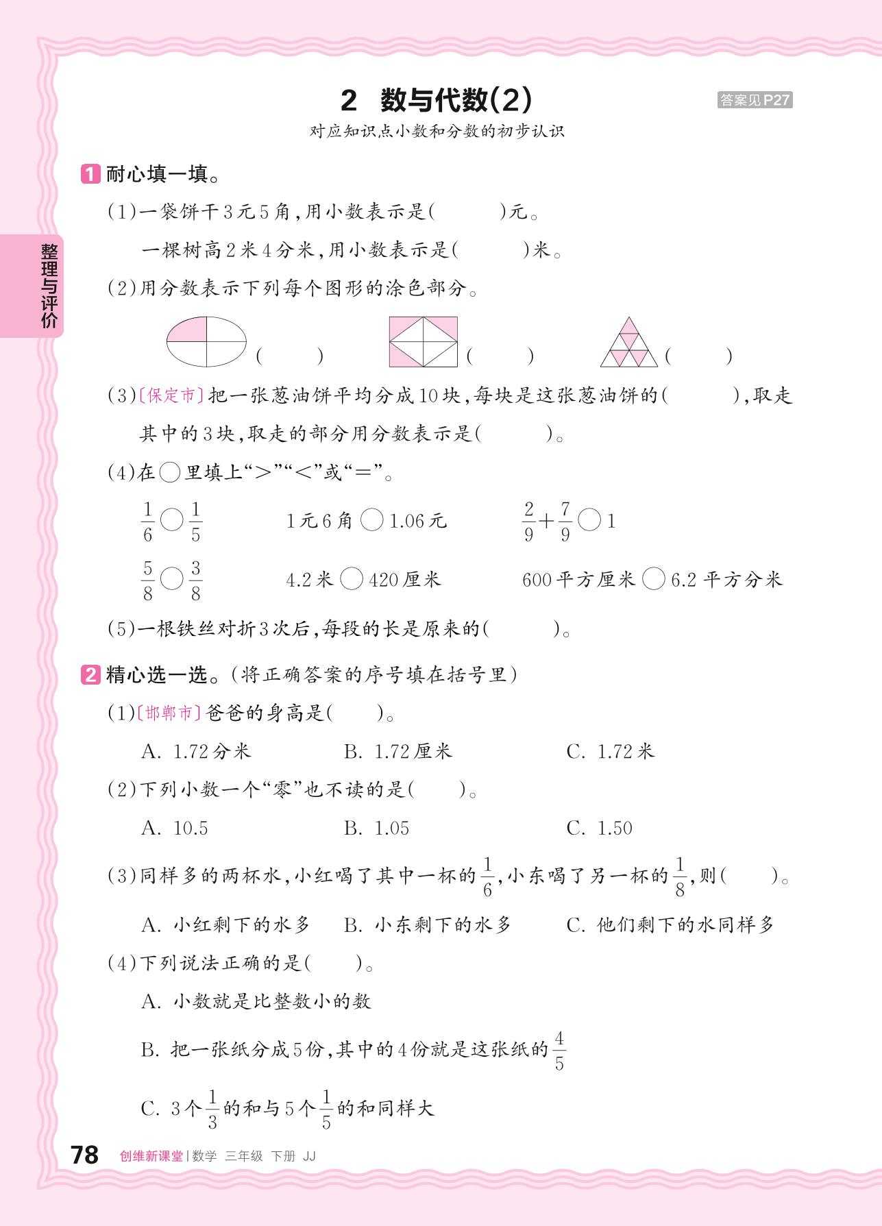 2024春下册三年级数学冀教版 整理与评价——2. 数与代数(2)