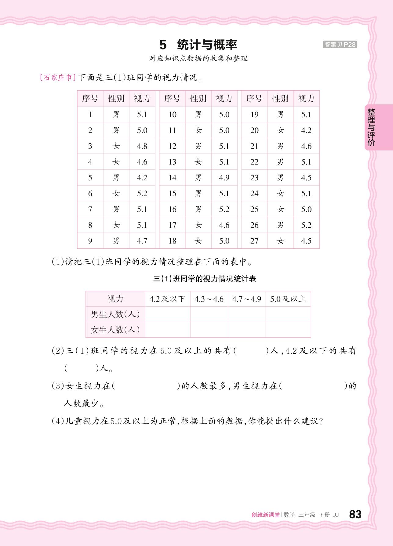 2024春下册三年级数学冀教版 整理与评价——5. 统计与概率