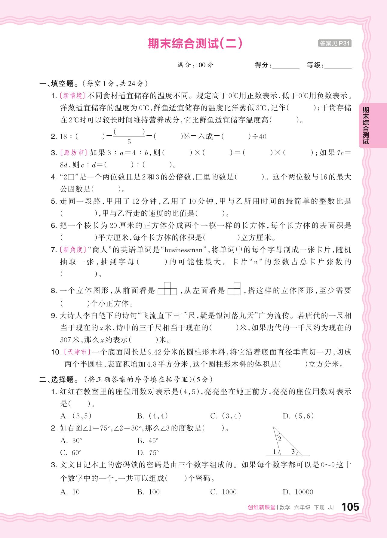 2024春下册六年级数学冀教版 期末综合测试(二)