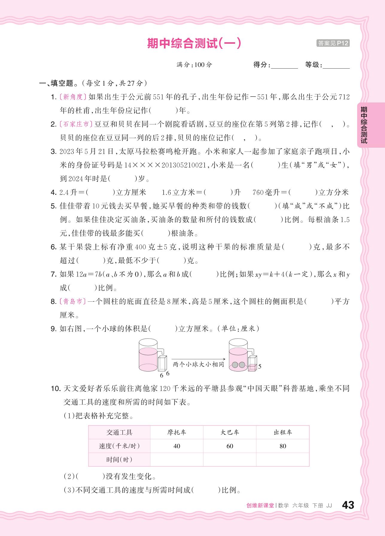 2024春下册六年级数学冀教版 期中综合测试(一)