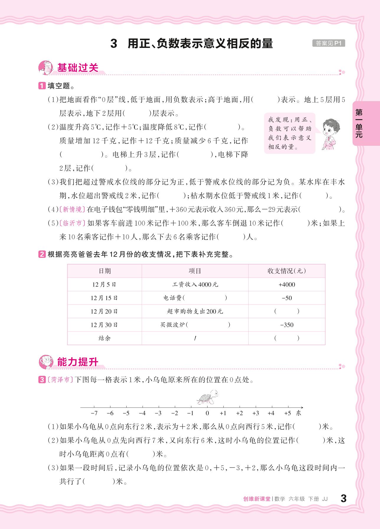 2024春下册六年级数学冀教版 第一单元 生活中的负数——3. 用正、负数表示意义相反的量