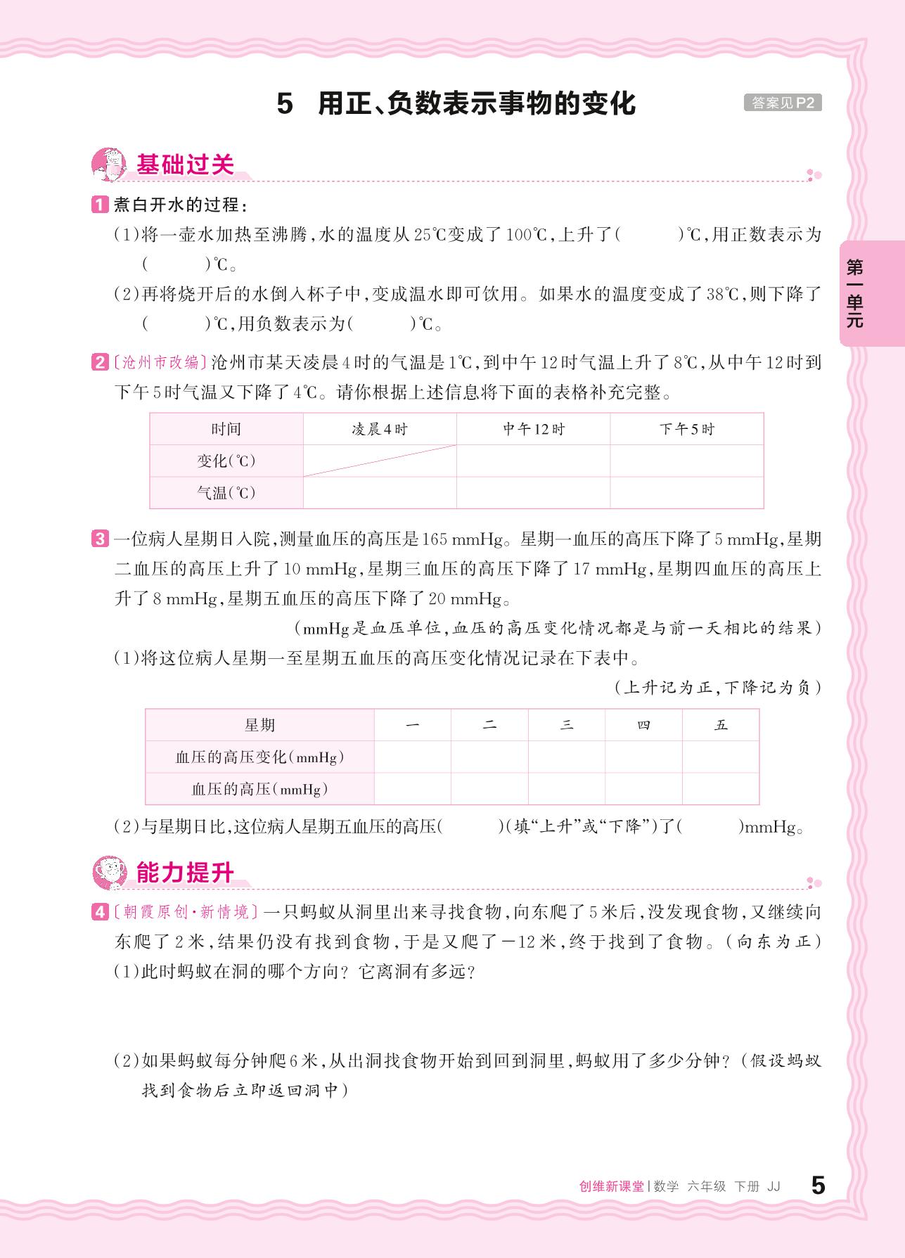 2024春下册六年级数学冀教版 第一单元 生活中的负数——5. 用正、负数表示事物的变化