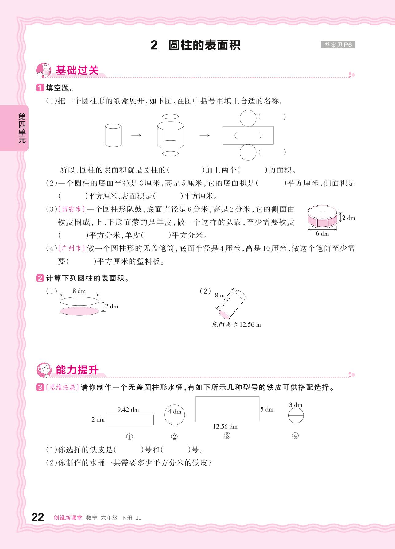 2024春下册六年级数学冀教版 第四单元 圆柱和圆锥——2. 圆柱的表面积