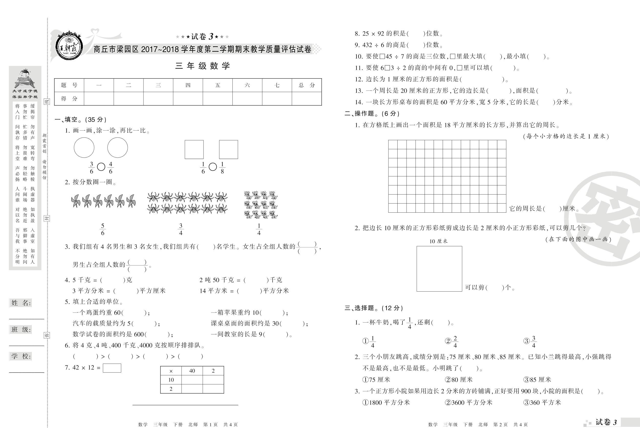 2017-2018学年第二学期商丘市梁园区三年级数学试卷(北师版)【3】