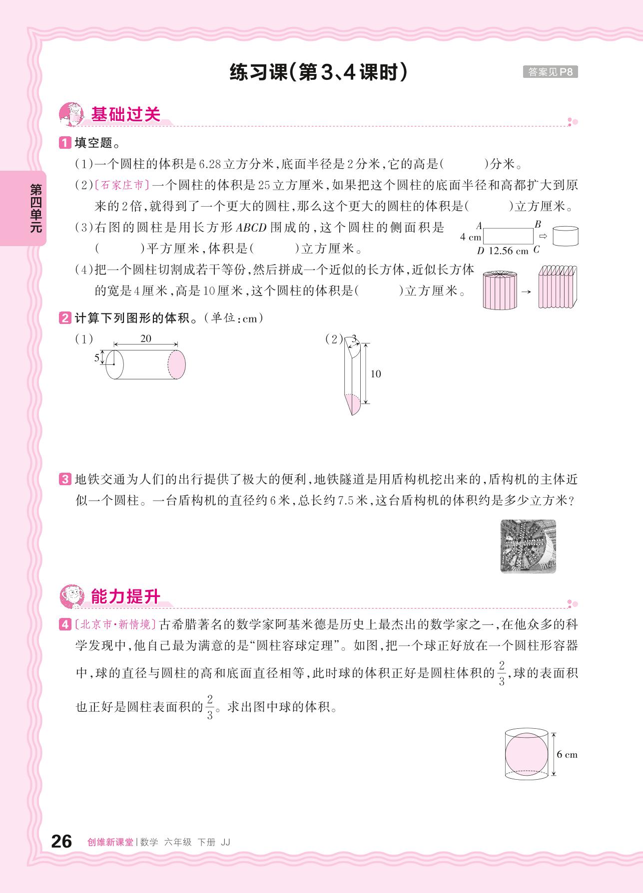 2024春下册六年级数学冀教版 第四单元 圆柱和圆锥——圆柱的体积练习课